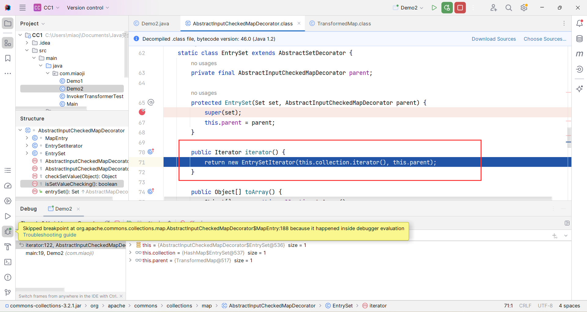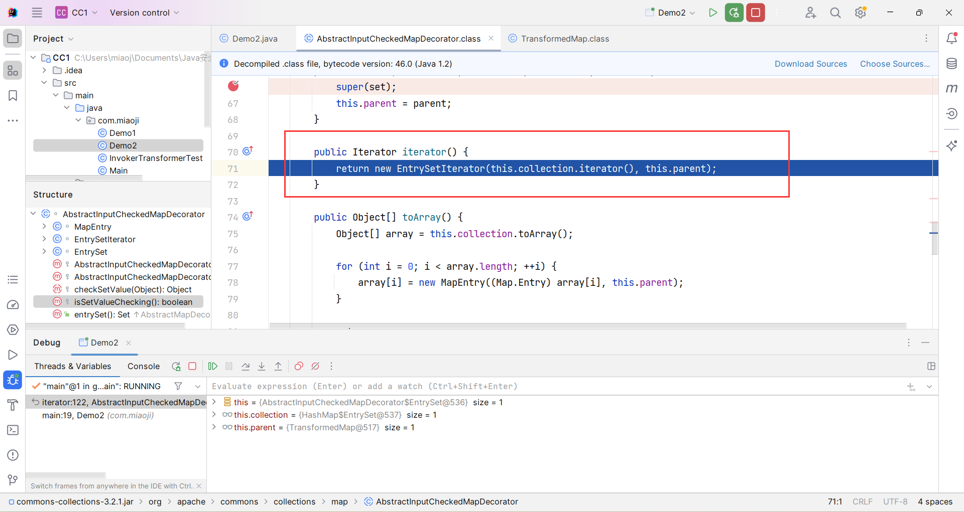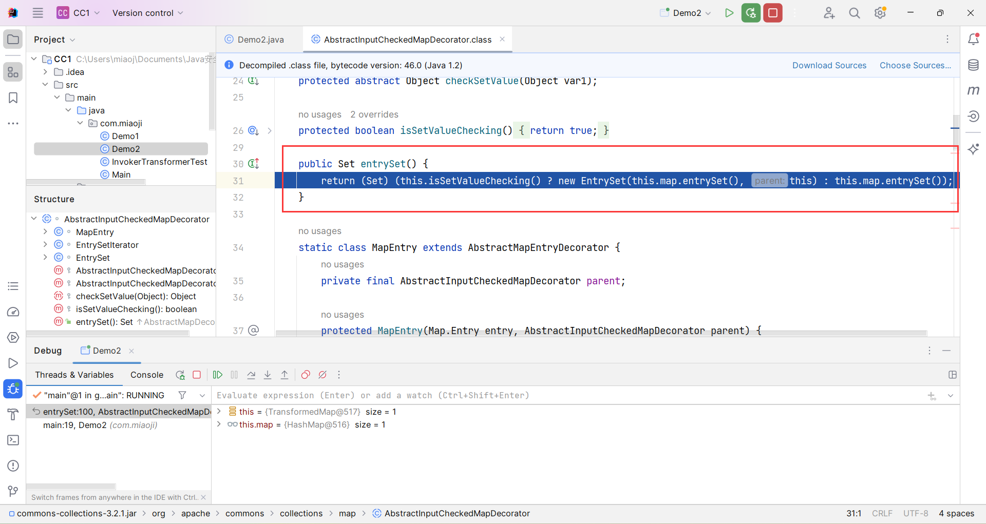 此时来到了 AbstractInputCheckedMapDecorator 抽象类的 entrySet 方法,不过严格来说,应该是调用了 TransformedMap 的 entrySet 方法(因为 TransformedMap 继承了 AbstractInputCheckedMapDecorator 抽象类,拥有了它的所有方法,所以 TransformedMap 中其实是有 entrySet 方法的,只不过在代码上看不到)