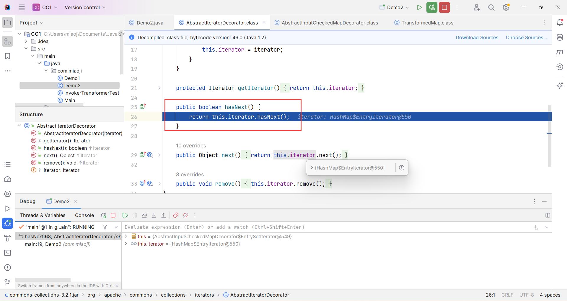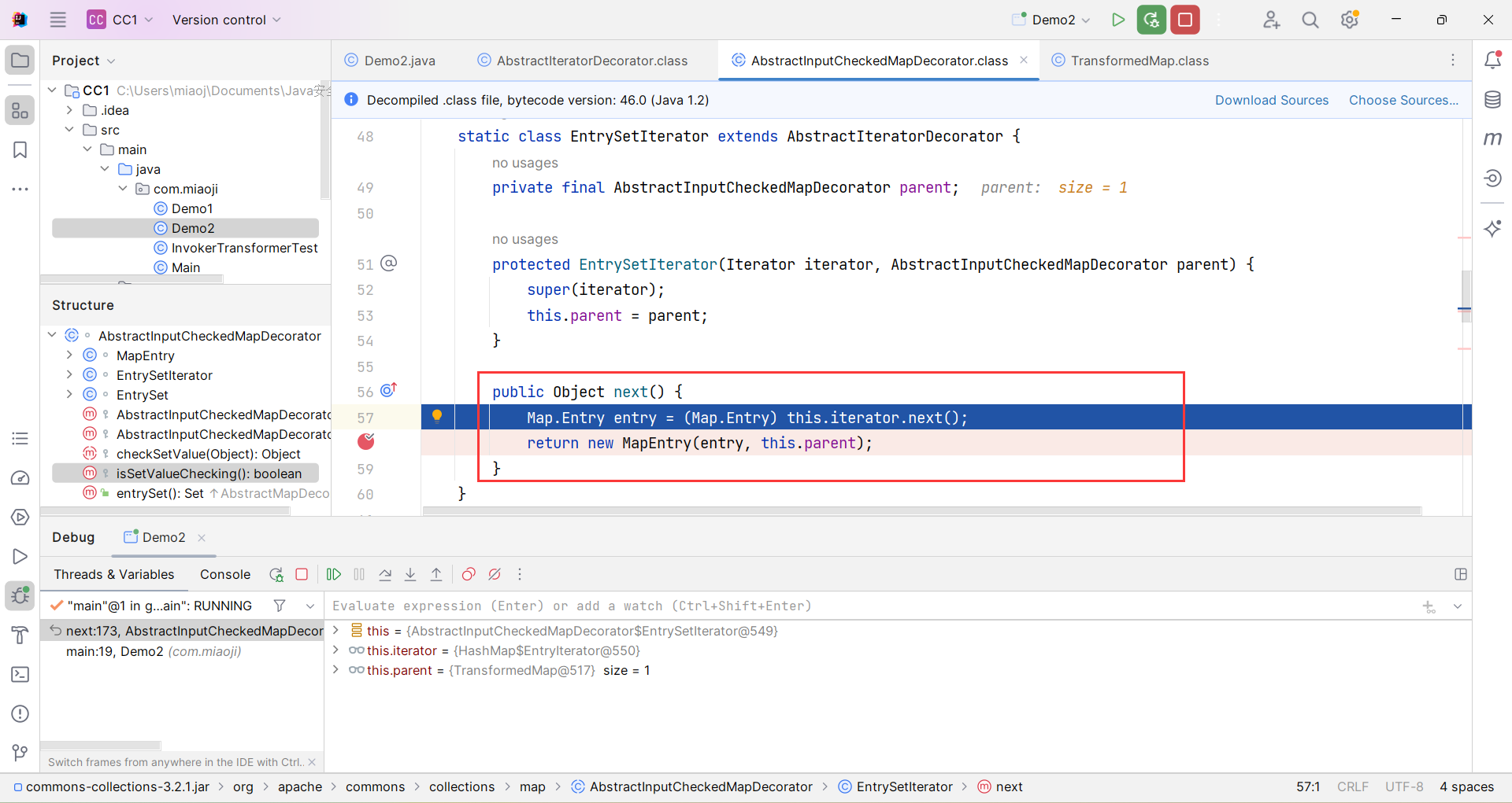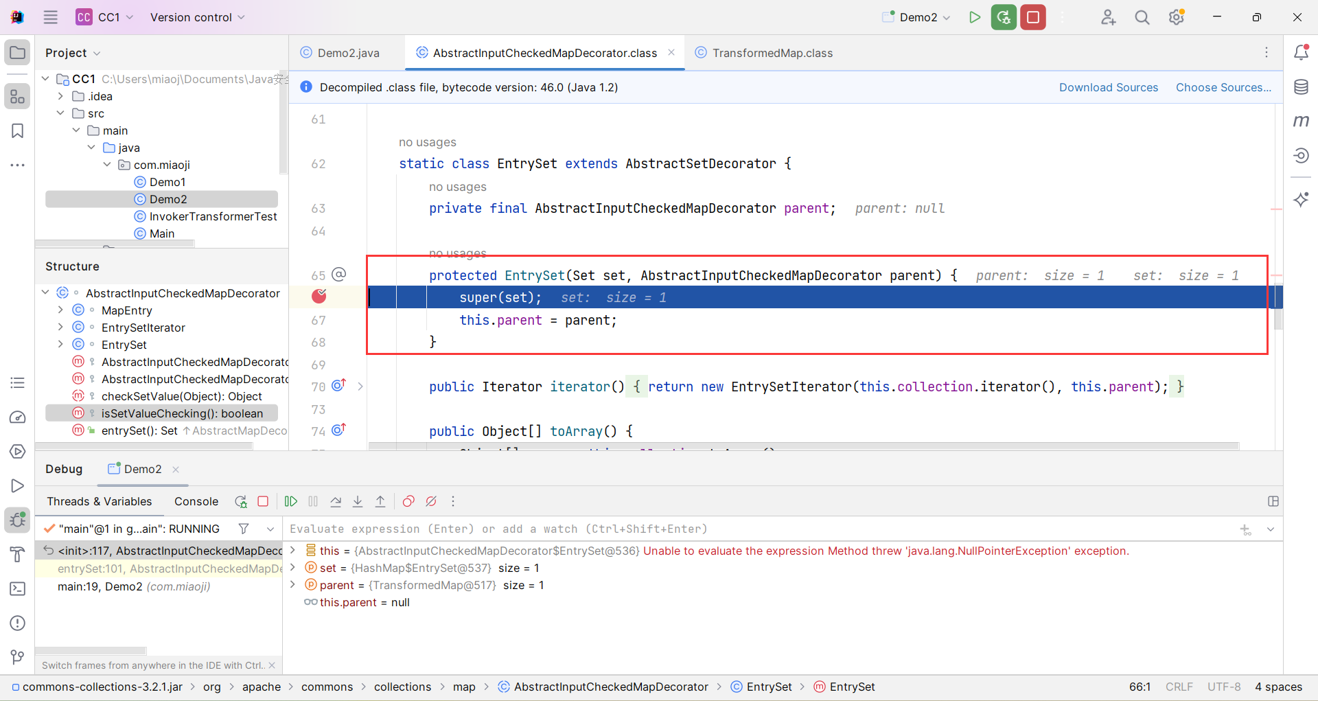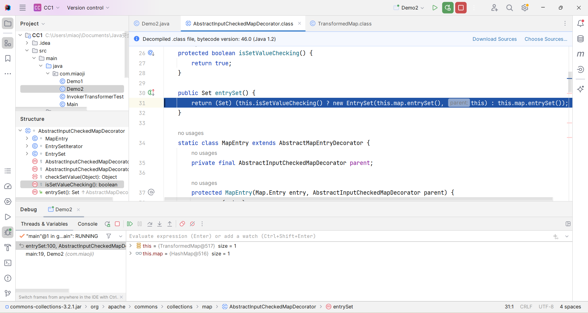 此时来到了 AbstractInputCheckedMapDecorator 抽象类的 entrySet 方法,不过严格来说,应该是调用了 TransformedMap 的 entrySet 方法(因为 TransformedMap 继承了 AbstractInputCheckedMapDecorator 抽象类,拥有了它的所有方法,所以 TransformedMap 中其实是有 entrySet 方法的,只不过在代码上看不到)