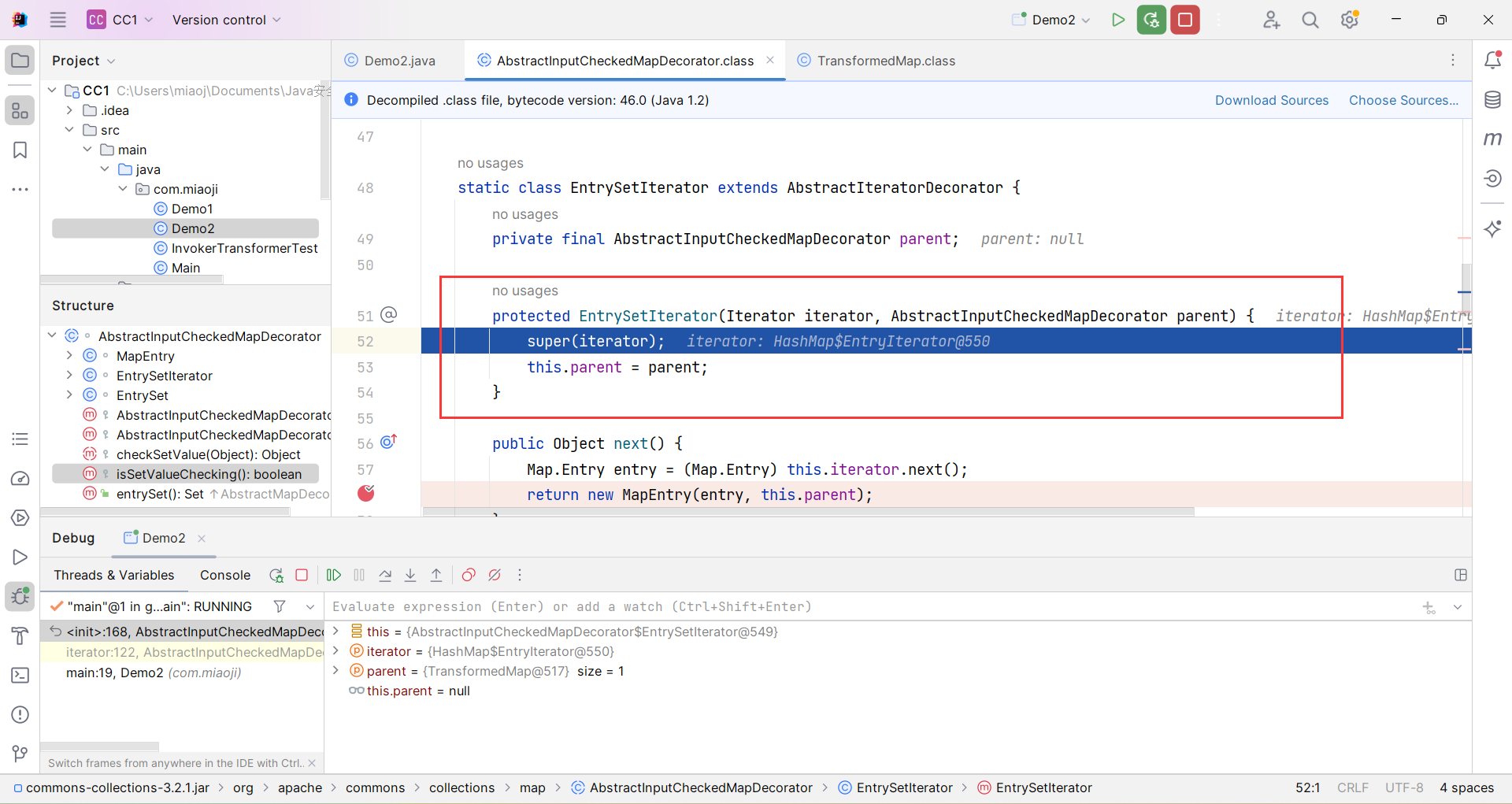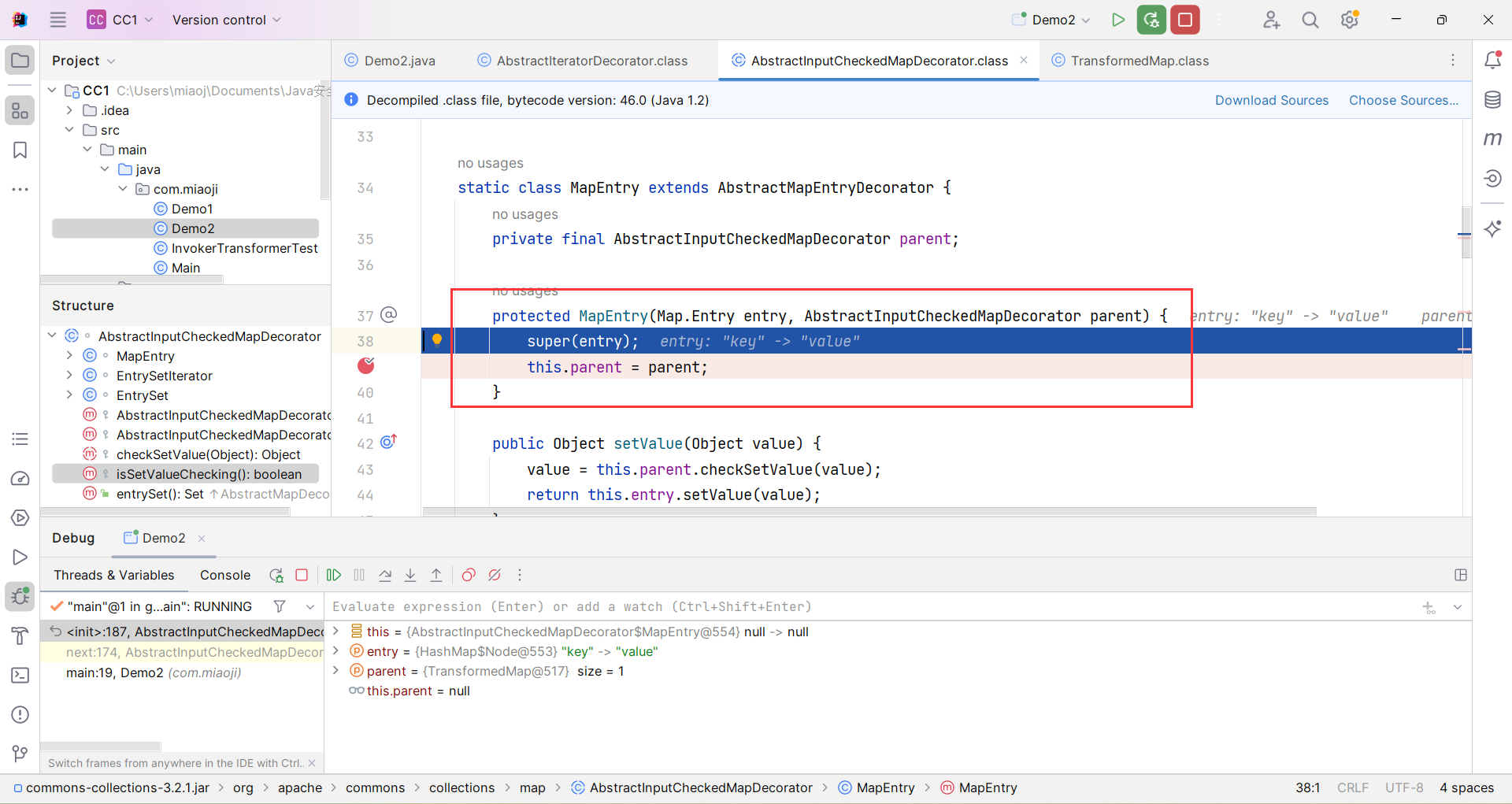 此时来到了 MapEntry 的构造方法,将 EntrySetIterator 的 parent 值传给了自己的私有属性 parent ,此时它是一个 TransformedMap 对象。