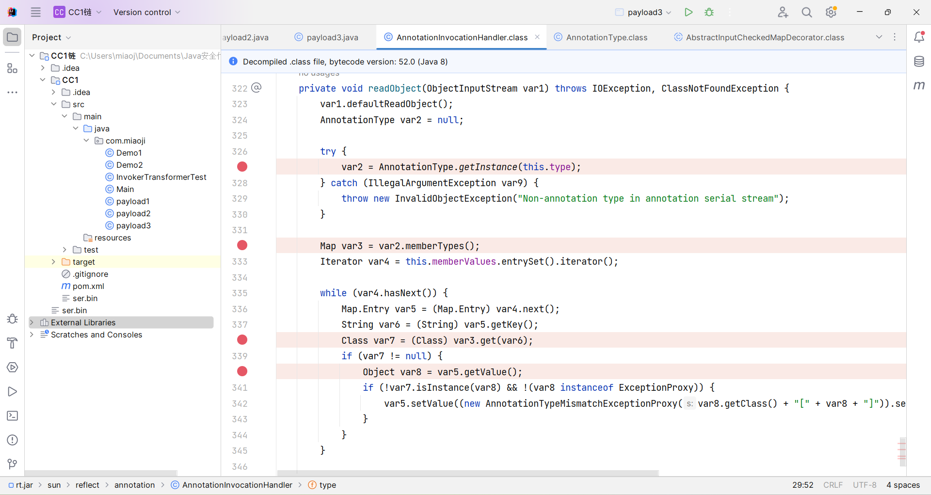 但是 payload2 还是无法使用,这是因为 AnnotationInvocationHandler 类的 readObject 方法中的最后一个 while 循环中还有两个判断没绕过,以及 var5 的 setValue 方法的参数还没有作控制。