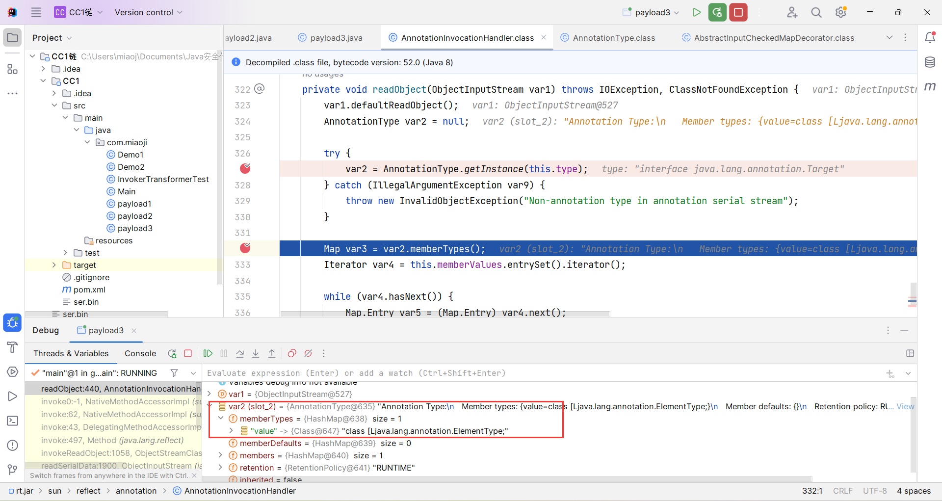 AnnotationInvocationHandler 类的 readObject 方法下四个断点: