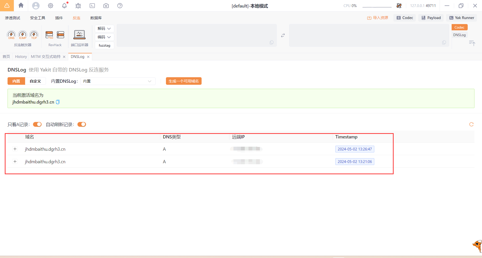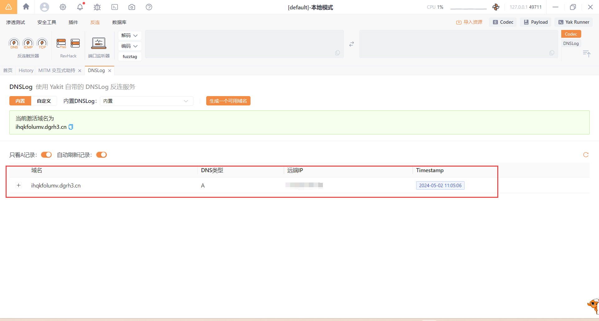 其中,ihqkfolumv.dgrh3.cn 是我们自己生成的域名,用于被 Java 程序访问,这样在 DNS 服务器上就会留下一条访问记录。