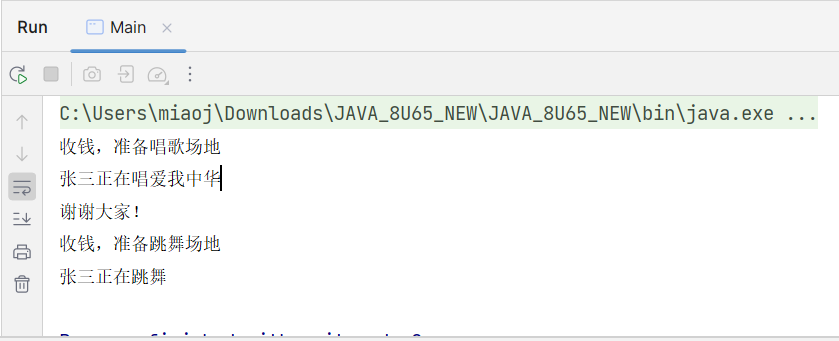 1 2 3 4 5 6 7 8 9 public class Test { public static void main(String[] args) { // 获取代理对象 Star starProxy = ProxyUtil.createProxy(new BigStar("张三")); String sing = starProxy.Sing("爱我中华"); System.out.println(sing); starProxy.Dance(); } }