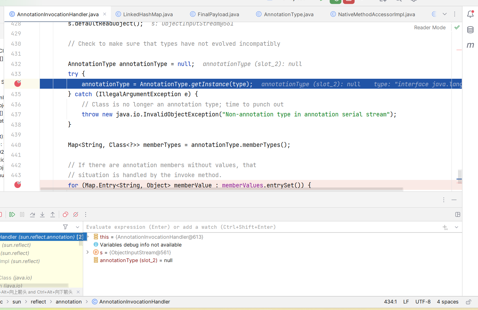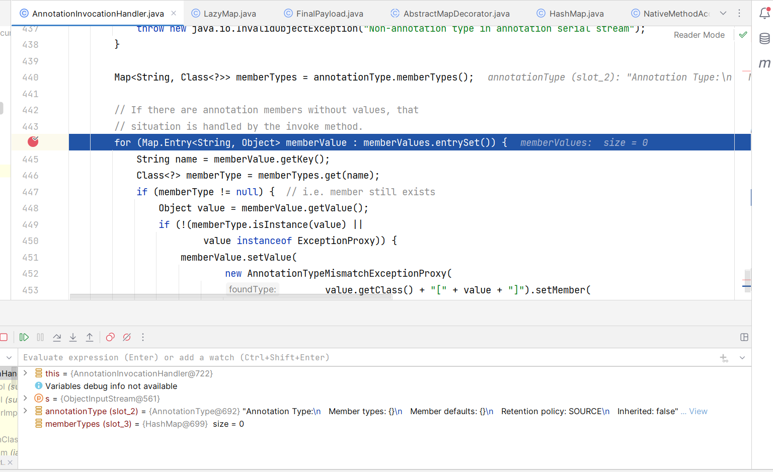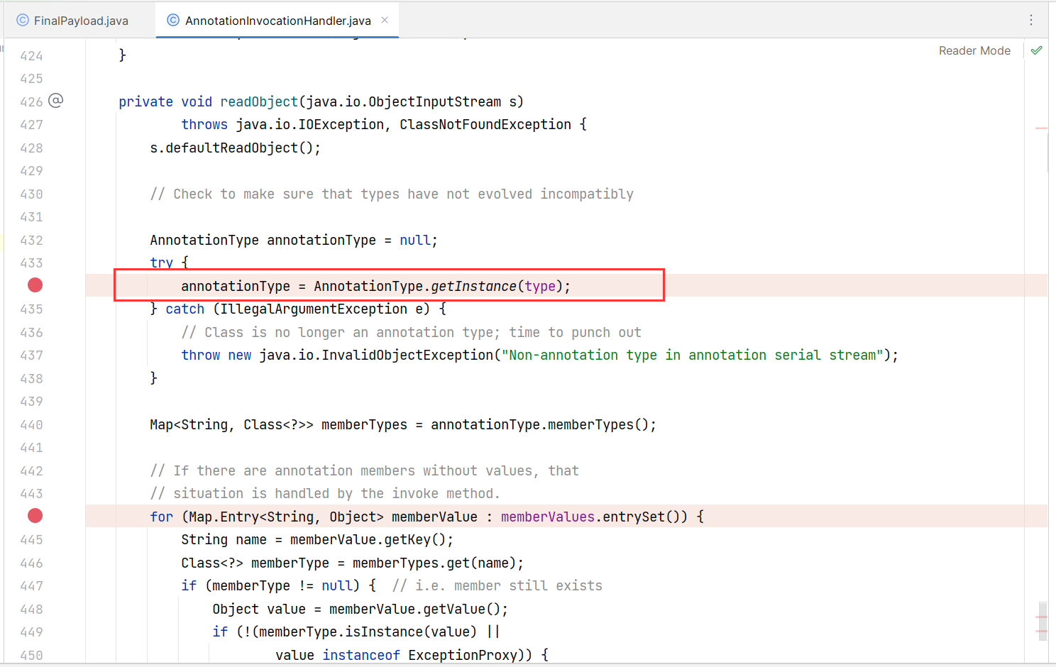 AnnotationType annotationType = null; try { annotationType = AnnotationType.getInstance(type); } catch(IllegalArgumentException e) { // Class is no longer an annotation type; time to punch out throw new java.io.InvalidObjectException("Non-annotation type in annotation serial stream"); }