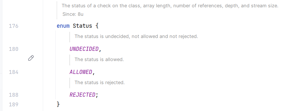 从报错信息中,可以发现一个 ObjectInputFilter 接口,其中定义了三种状态,分别是未定义、接受和拒绝: