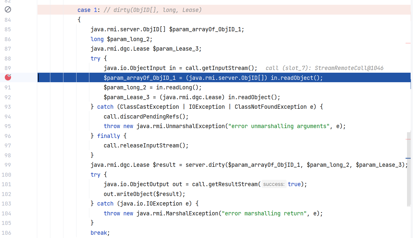 | TCPTransport#handleMessages(Connection, boolean) Transport#serviceCall(RemoteCall) UnicastServerRef#dispatch(Remote, RemoteCall) UnicastServerRef#oldDispatch(Remote, RemoteCall, int) DGCImpl_Skel#dispatch(java.rmi.Remote, java.rmi.server.RemoteCall, int, long)