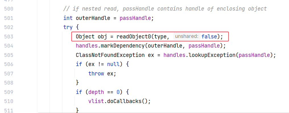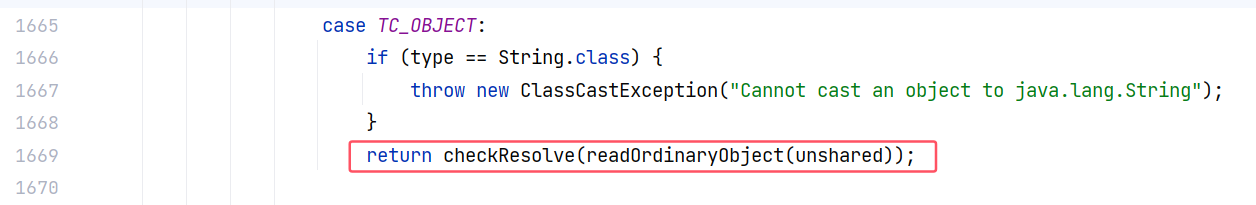 跟进 ObjectInputStream#readOrdinaryObject(boolean),这个方法用于读取并返回普通对象: