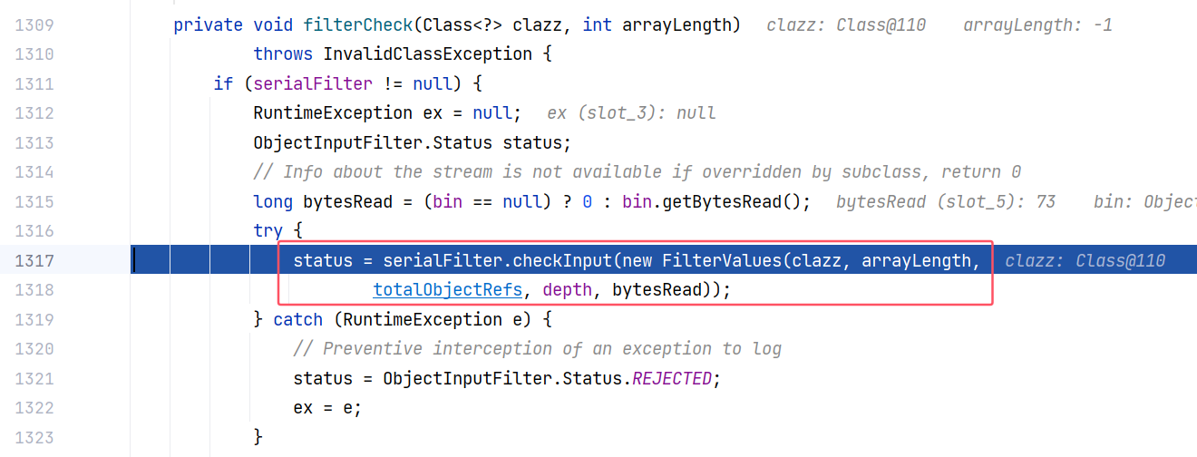 | private void filterCheck(Class<?> clazz, int arrayLength)         throws InvalidClassException {     if (serialFilter != null) {         RuntimeException ex = null;         ObjectInputFilter.Status status;         // Info about the stream is not available if overridden by subclass, return 0         long bytesRead = (bin == null) ? 0 : bin.getBytesRead();         try {             status = serialFilter.checkInput(new FilterValues(clazz, arrayLength,                     totalObjectRefs, depth, bytesRead));         } catch (RuntimeException e) {             // Preventive interception of an exception to log             status = ObjectInputFilter.Status.REJECTED;             ex = e;         }         if (status == null  ||                 status == ObjectInputFilter.Status.REJECTED) {             // Debug logging of filter checks that fail             if (Logging.infoLogger != null) {                 Logging.infoLogger.info(                         "ObjectInputFilter {0}: {1}, array length: {2}, nRefs: {3}, depth: {4}, bytes: {5}, ex: {6}",                         status, clazz, arrayLength, totalObjectRefs, depth, bytesRead,                         Objects.toString(ex, "n/a"));             }             InvalidClassException ice = new InvalidClassException("filter status: " + status);             ice.initCause(ex);             throw ice;         } else {             // Trace logging for those that succeed             if (Logging.traceLogger != null) {                 Logging.traceLogger.finer(                         "ObjectInputFilter {0}: {1}, array length: {2}, nRefs: {3}, depth: {4}, bytes: {5}, ex: {6}",                         status, clazz, arrayLength, totalObjectRefs, depth, bytesRead,                         Objects.toString(ex, "n/a"));             }         }     } }
