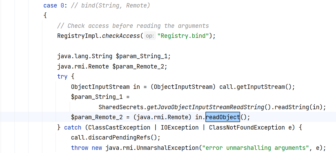 而对其他方法比如 list、lookup、unbind 的处理逻辑则是没有调用 readObject 方法的。也就是说这个新增的机制只影响 Server 端对 Registry 端的攻击,对其他的攻击没有影响。具体来说,就是只影响 bind 和 rebind 方法的结果。之前提到的针对 Server 端和 Client 端的攻击依然可行。