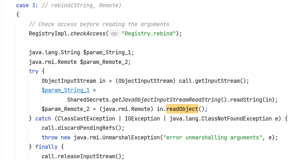 其调用链与 DGC 相似,只不过是在 RegistryImpl_Skel 的 dispatch 方法触发。不过值得注意的是,这个方法只对 bind 和 rebind 的处理逻辑有反序列化的操作。