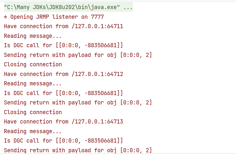 会一直弹出计算器,是因为 Registry 端不断地在向 exploit/JRMPListener 发起 DGC 调用请求,不断地收到异常类: