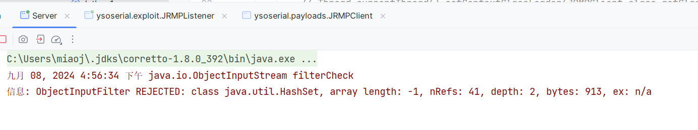 现在使用 JDK 8u392 ,再次运行 ysoserial 中的 payloads/JRMPListener 和 exploit/JRMPClient ,会爆出如下错误: