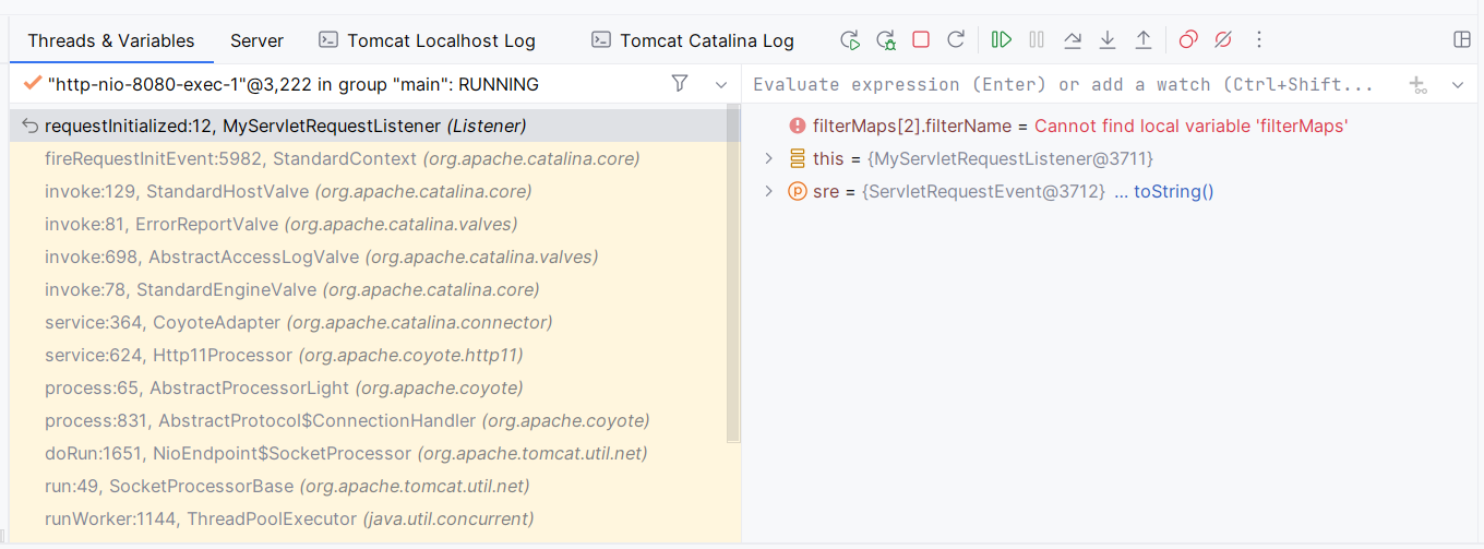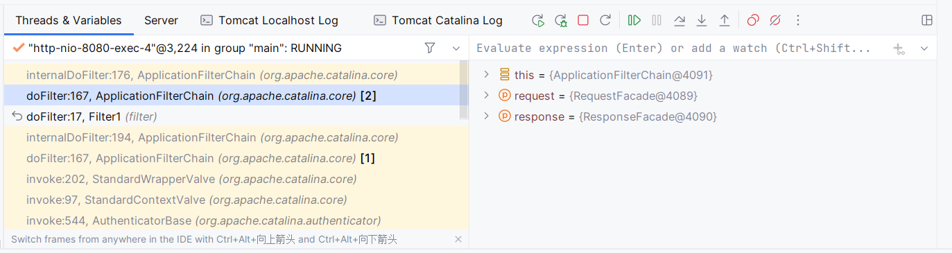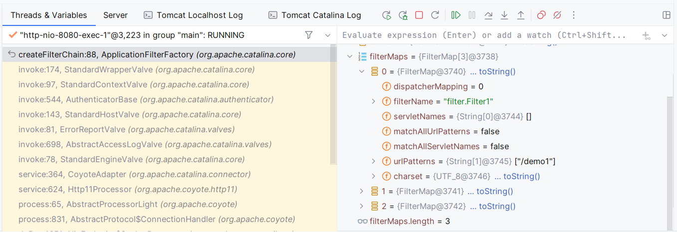 Filter 链的调用 在 Filter1 的 doFilter 处下断点,开始调试:
