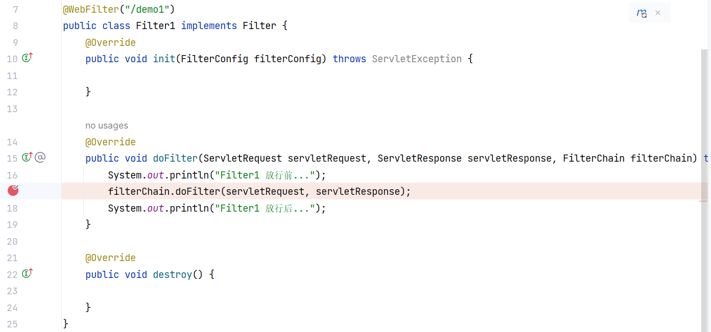 1 2 3 4 5 6 7 8 9 10 11 12 13 14 15 16 17 18 19 20 21 22 23 24 25 package filter; import javax.servlet.*; import javax.servlet.annotation.WebFilter; import java.io.IOException; @WebFilter("/demo1") public class Filter1 implements Filter { @Override public void init(FilterConfig filterConfig) throws ServletException { } @Override public void doFilter(ServletRequest servletRequest, ServletResponse servletResponse, FilterChain filterChain) throws IOException, ServletException { System.out.println("Filter1 放行前..."); filterChain.doFilter(servletRequest, servletResponse); System.out.println("Filter1 放行后..."); } @Override public void destroy() { } }