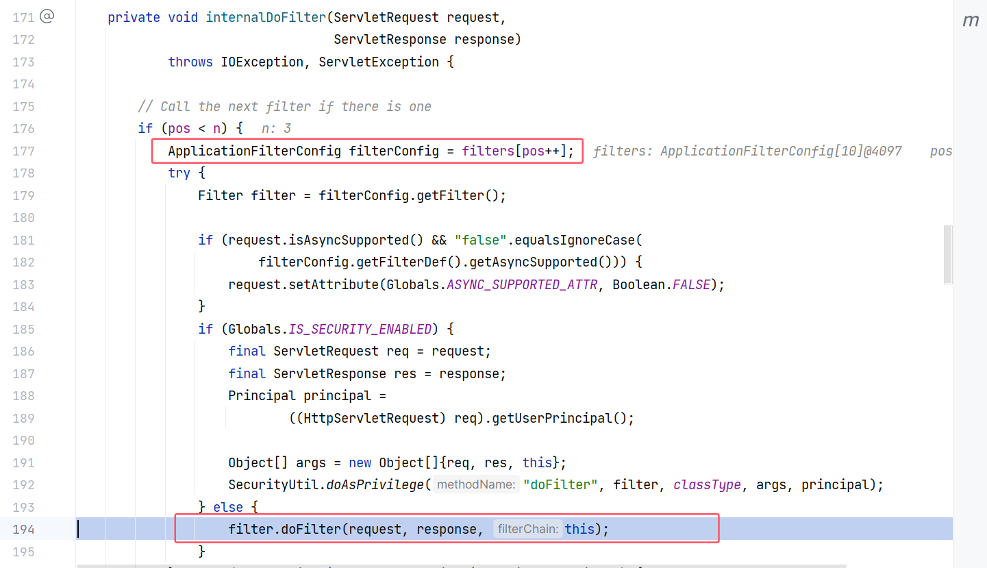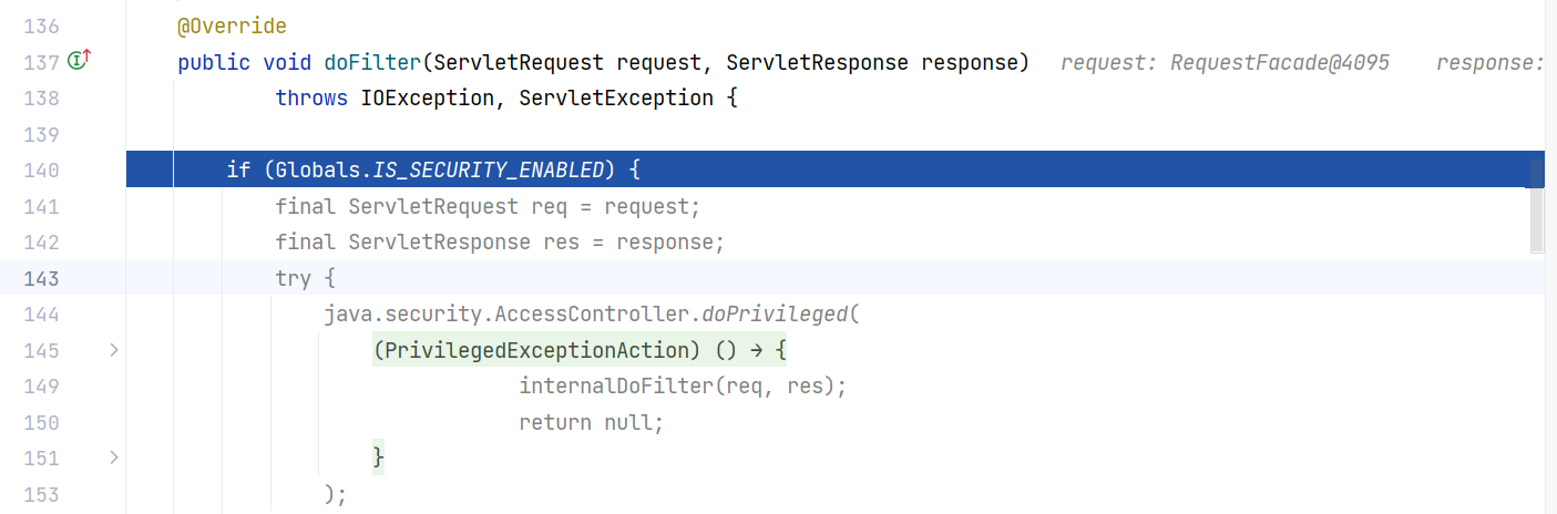 这里会判断 Globals.IS_SECURITY_ENABLED 安全设置开了没有,开了的话就通过 java.security.AccessController#doPrivileged 方法来调用 internalDoFilter(req,res) ,没开的话就直接调用: