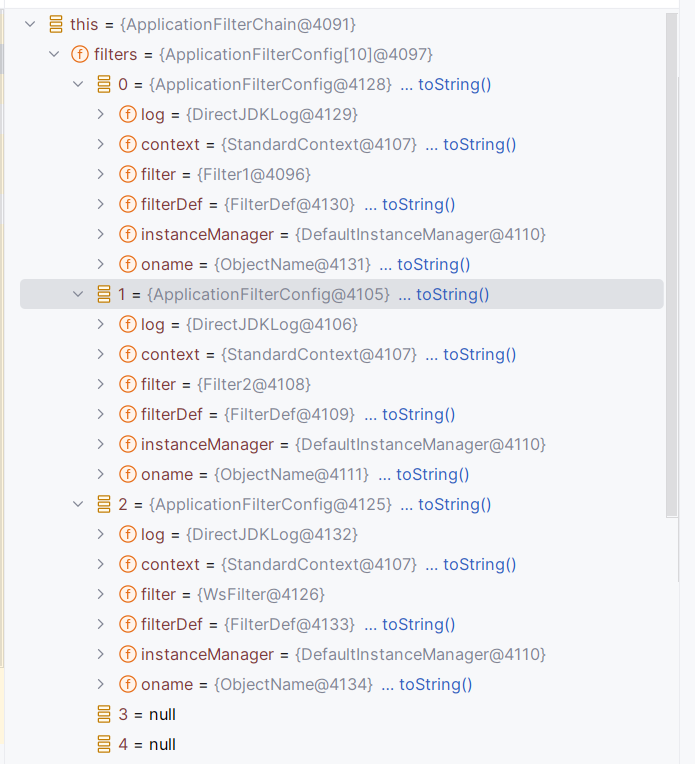 在这个 filter 数组中获取要调用的 filter 链,再从中获取 filter ,调用它的 doFilter 方法。比如 Filter1.doFilter 调用到这里就获取 Filter2,调用 Filter2.doFilter 。也可以来看一下这个 filter 数组里面存了些什么: