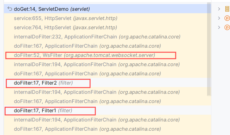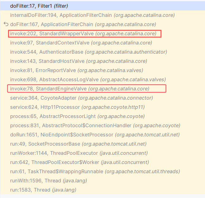 前面是 tomcat 的一些逻辑,从 Filter1.doFilter 开始,后面就是很规律的调用 ApplicationFilterChain#doFilter(ServletRequest, ServletResponse) 和 ApplicationFilterChain#internalDoFilter(ServletRequest, ServletResponse) 。