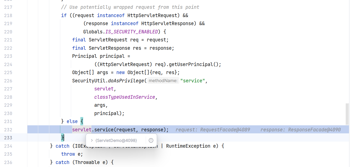 而在调用完 WsFilter.doFilter 之后最后一次进入 ApplicationFilterChain#internalDoFilter(ServletRequest, ServletResponse) ,则会调用 servlet.service 方法: