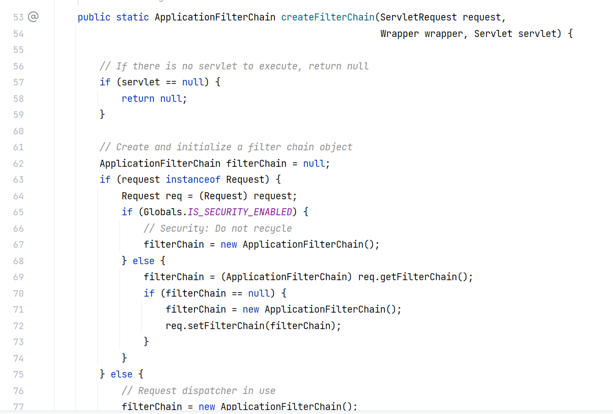 通过调用 ApplicationFilterFactory.createFilterChain 方法获取了一个 filterChain ,跟进它: