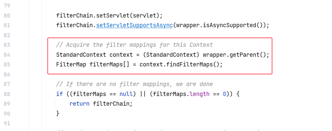 接着往下,把 servlet 放进 filterChain 中。从 wrapper 中获取其所属的上级容器,即 Context 。在 Tomcat 中,容器是按层次结构组织的,Wrapper 是表示单个 Servlet,而 Context 表示整个 Web 应用。获取到 StandardContext 对象之后,又从其中获取了一个 FilterMap :