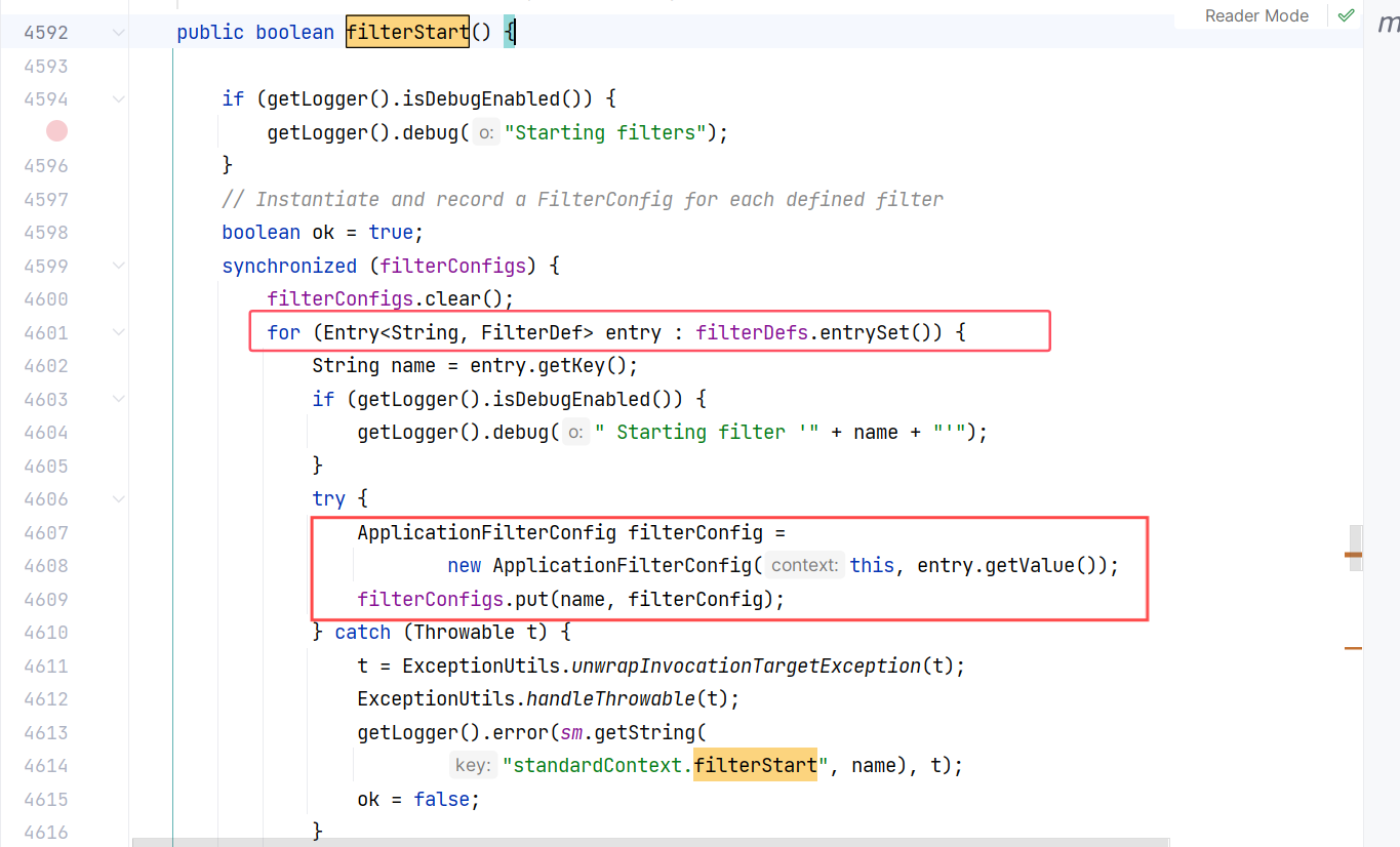 FilterConfigs 则是在 StandardContext#filterStart 方法中赋值的,这里是调用的 ApplicationFilterConfig 的构造方法创建 filterConfig :