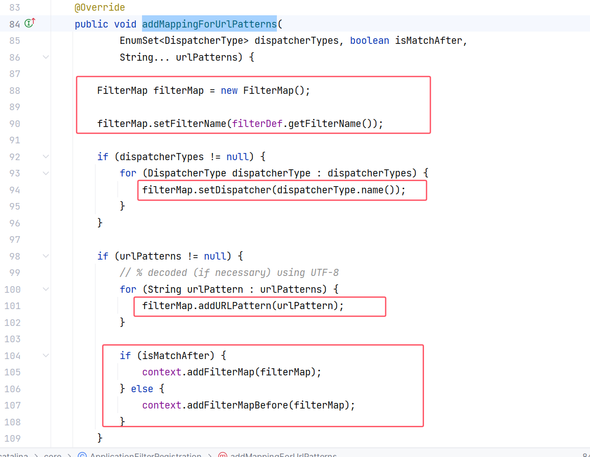 至于上面这两个方法的调用可以在 ApplicationFilterRegistration#addMappingForUrlPatterns 中看到: