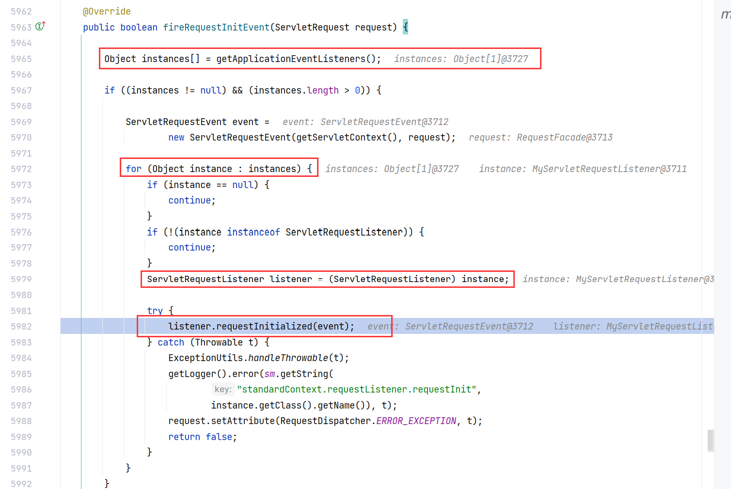 是 StandardContext#fireRequestInitEvent 调用了我的 requestInitialized 方法,跟进它: