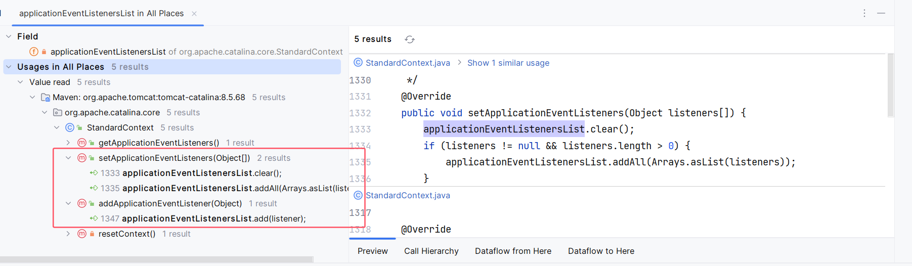 applicationEventListenersList 是 StandardContext 的一个成员属性,关注一下它是在哪被赋值的: