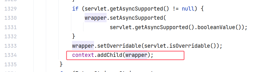 1 2 3 4 5 6 7 Wrapper wrapper = standardContext.createWrapper(); wrapper.setLoadOnStartup(servlet.getLoadOnStartup().intValue()); wrapper.setName(servlet.getServletName()); wrapper.setServletClass(servlet.getServletClass()); wrapper.setServlet(servlet); standardContext.addChild(wrapper); standardContext.addServletMappingDecoded("/miaoji", servlet.getServletName());