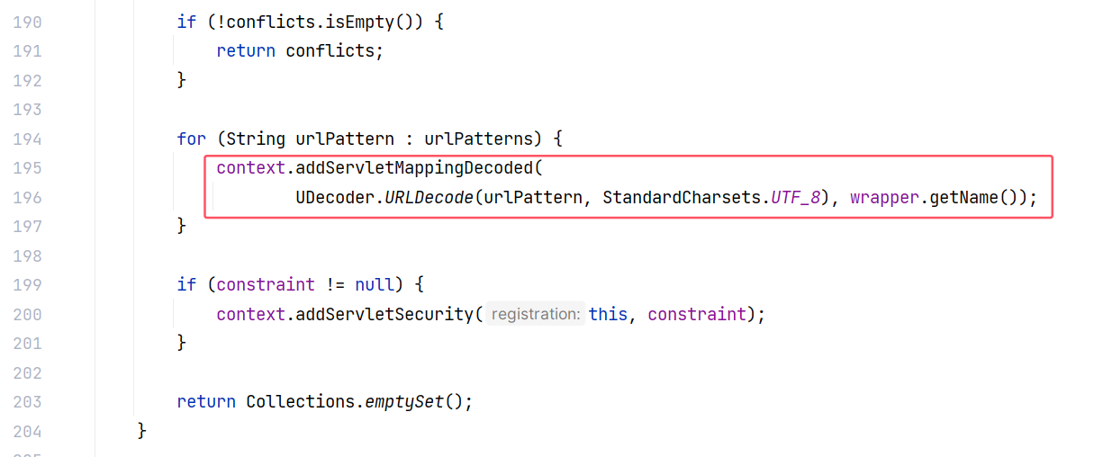 从中同样可以提取出对于 wrapper 的封装过程。这里返回的是一个 ApplicationServletRegistration 对象,至于 mappings 映射的添加,在 ApplicationServletRegistration 的 addMapping 方法里: