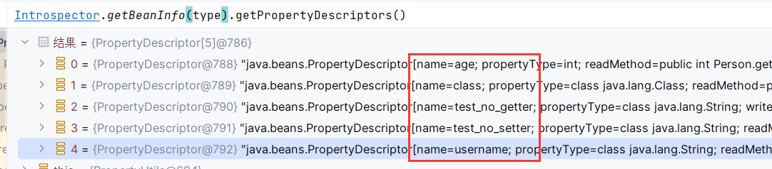 调试到这里来计算一下 Introspector.getBeanInfo(type).getPropertyDescriptors() 的结果,可以看到返回结果中不包含既没有 getter 也没有 setter 的属性: