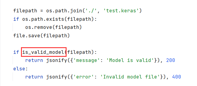 从源码中分析,可知其会把上传的文件保存成 ./test.keras ,随后调用 is_valid_model 函数进行处理: