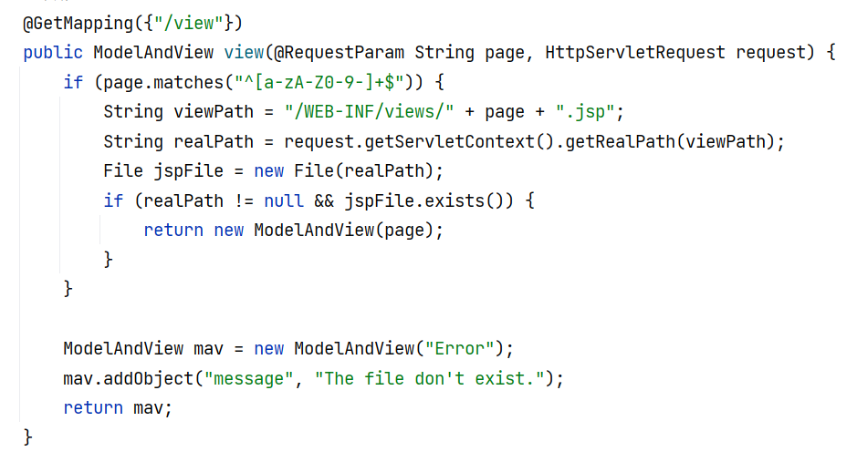 /view 用来查看 /WEB-INF/views/ 目录下后缀为 .jsp 的文件,参数 page 被限制为只能输入字母数字: