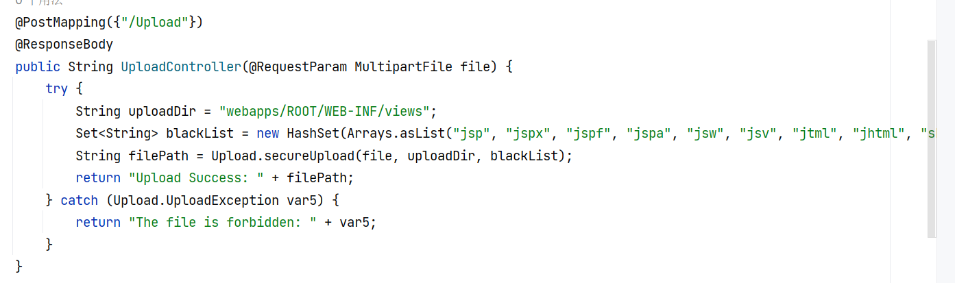 /Upload 用来上传文件,上传的路径为 webapps/ROOT/WEB-INF/views ,其中有文件后缀黑名单: