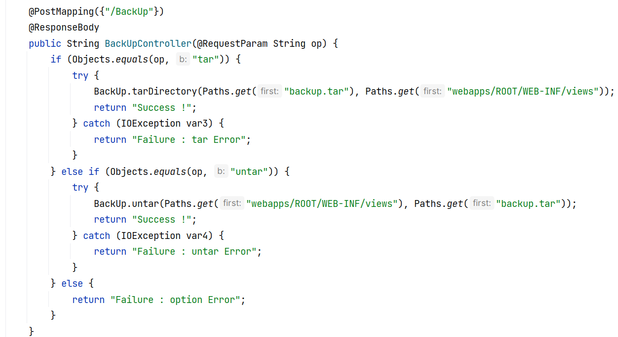 /BackUp 用来压缩和解压缩,压缩时传入 op=tar ,会将 webapps/ROOT/WEB-INF/views/ 目录下的所有文件压缩成 backup.tar,解压缩时传入 op=untar ,会将 webapps/ROOT/WEB-INF/views/backup.tar 解压缩:
