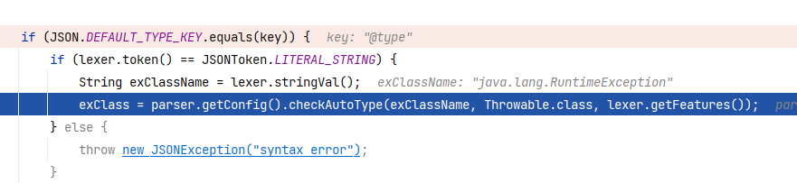 然后需要注意,最开头的 key (@type)已经在上一个方法中被取走了,我们这里会读到下一个 key ,而下一个 key @type 指向的值为 pojo.MyException :