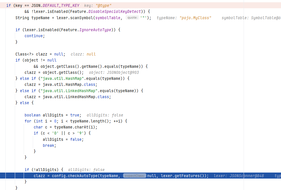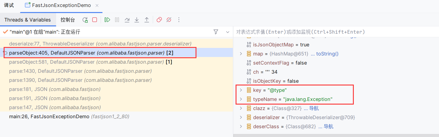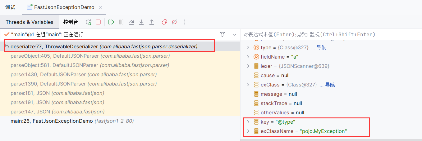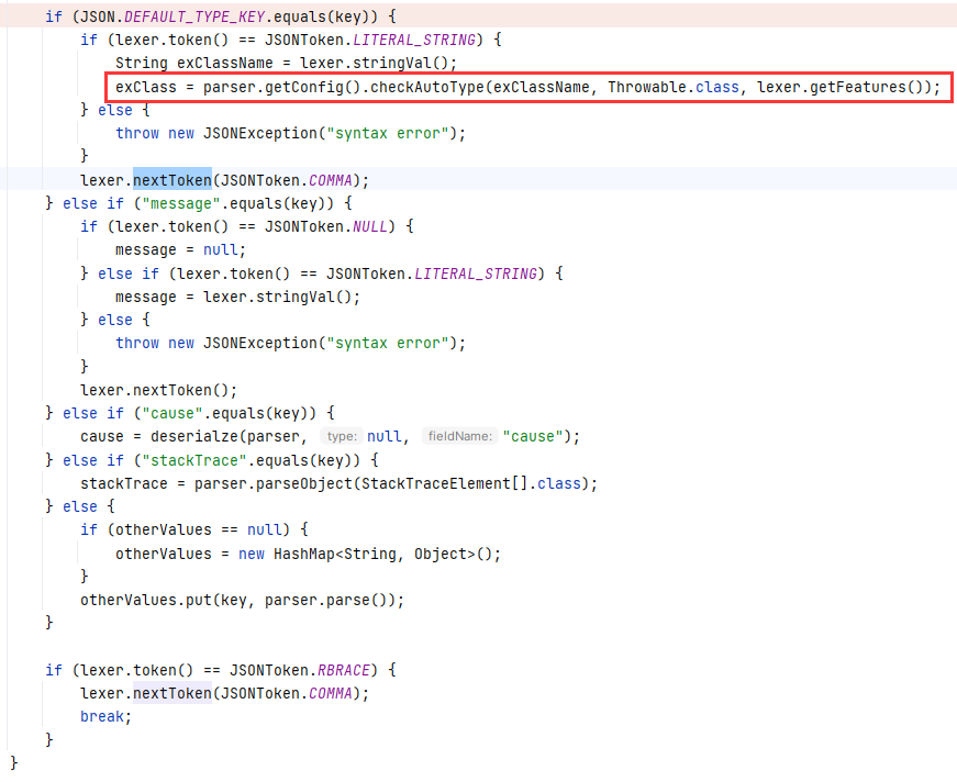 然后需要注意,最开头的 key (@type)已经在上一个方法中被取走了,我们这里会读到下一个 key ,而下一个 key @type 指向的值为 pojo.MyException :