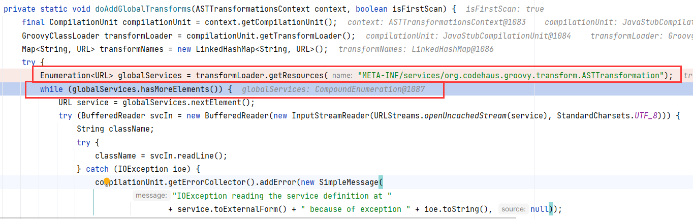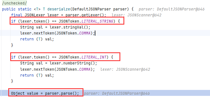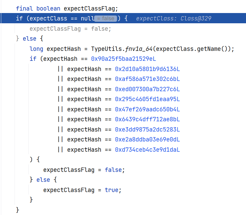 这里有一个细节,按理说 StringCodec 应该继续递归反序列化 SourceTypeCollisionException ,但是提前返回了。对比 poc 中两次出现 “java.lang.String” ,第一次后面跟的是 { ,第二次后面跟的是字符串 "@type" 。StringCodec 的反序列化逻辑就是如遇 String 类型或是 int 类型则提前返回,如果不是这两种类型才会继续递归解析: