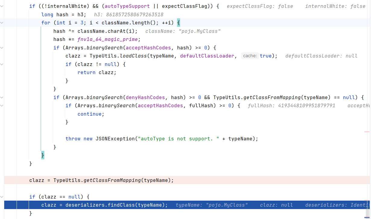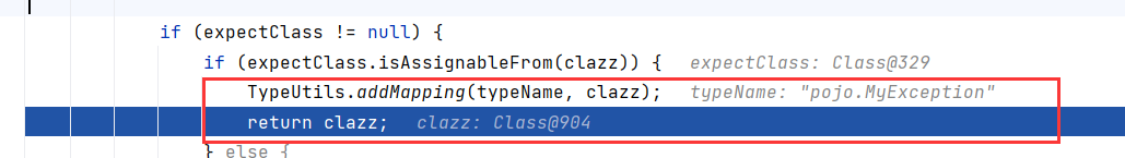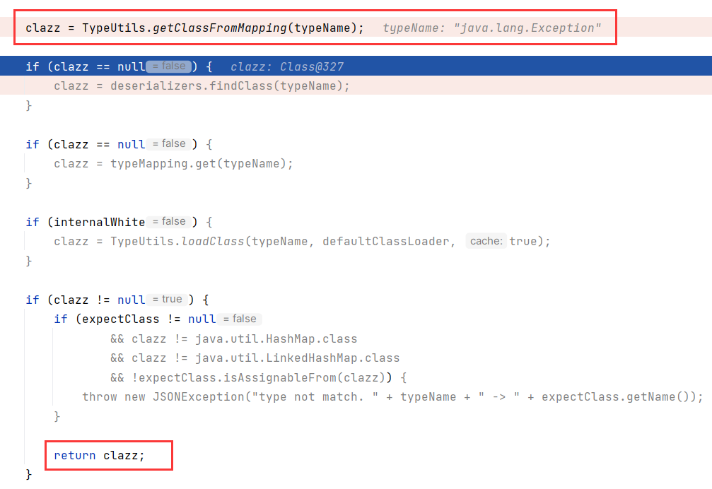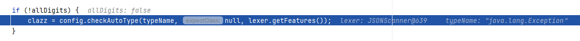 查看 checkAutoType 处理逻辑,由于当前类是 java.lang.Exception ,直接在 TypeUtils.mappings 中查找到并返回: