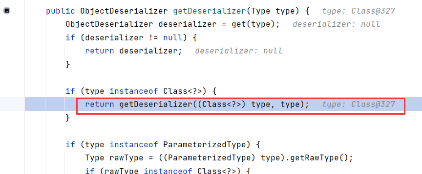 我们先来看获取反序列化器 ParserConfig#getDeserializer(Type) ,内部实际调用重构方法 getDeserializer(Class<?>, Type):