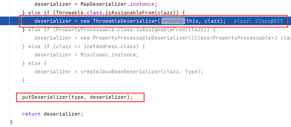 随后调用 ParserConfig#putDeserializer(Type, ObjectDeserializer) 将 java.lang.Exception -> ThrowableDeserializer 的映射关系缓存进 ParserConfig.deserializers 中: