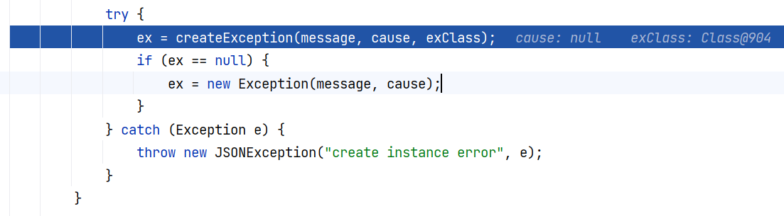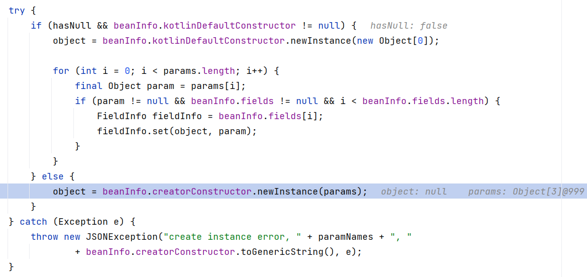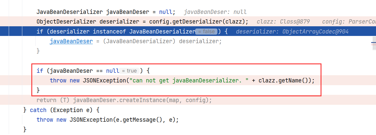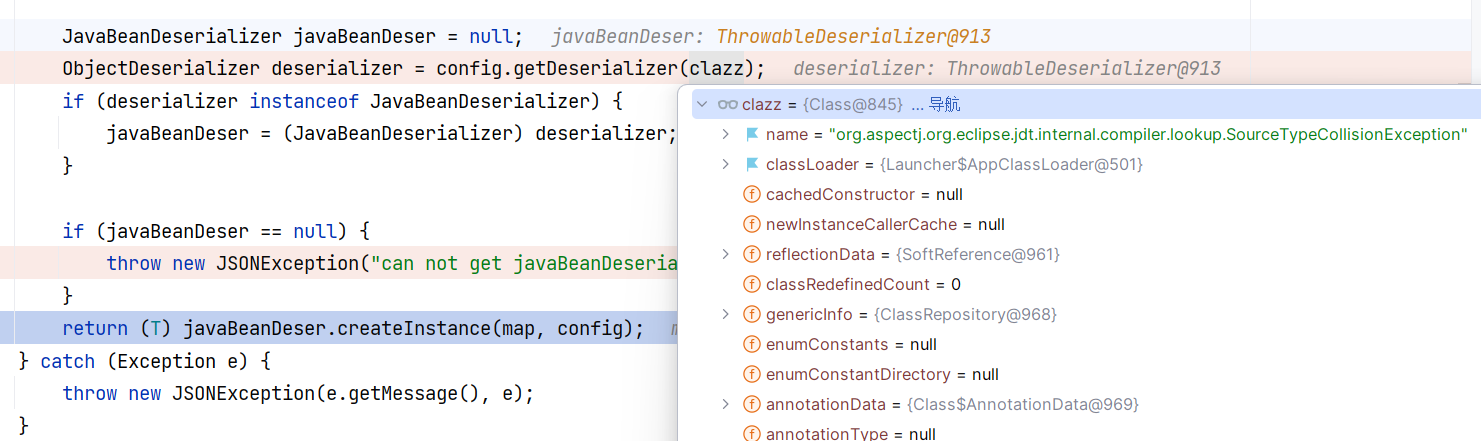 后续为下属标签 SourceTypeCollisionException 获取反序列化器,获取到 ThrowableDeserializer ,它可以被转换为 JavaBeanDeserializer 。于是通过检查,并进入后续创建实例部分: