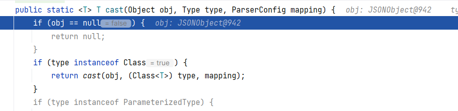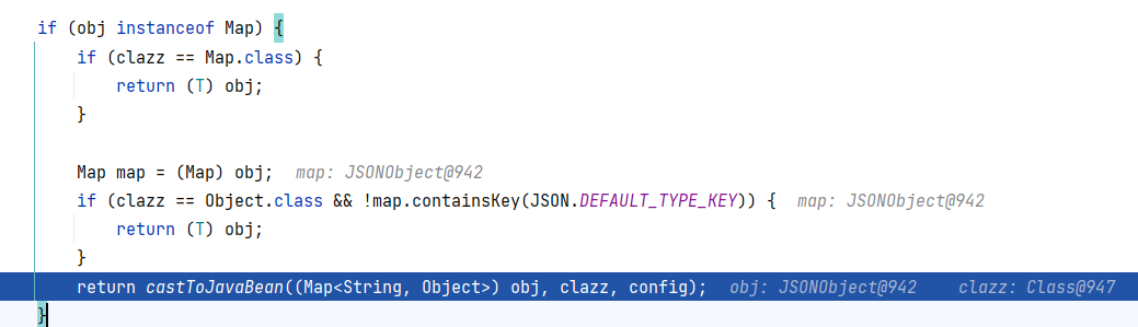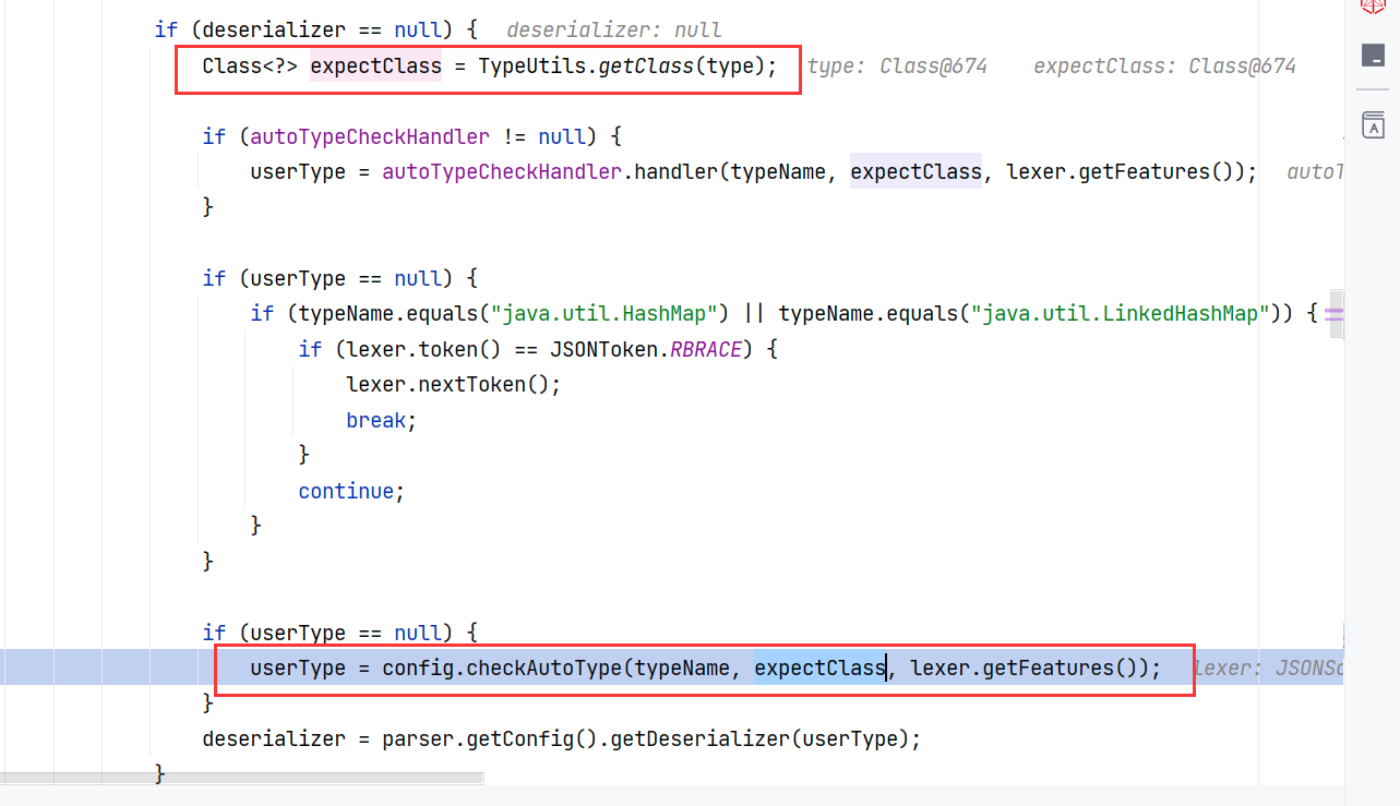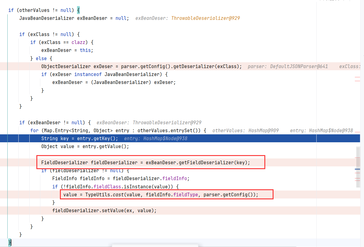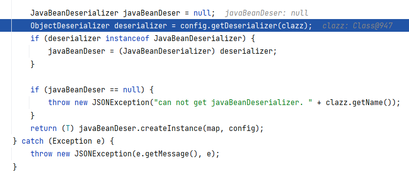 回到 DefaultJSONParser#parseObject(final Map, Object) ,接着往下,在这里获取到构造器 ThrowableDeserializer ,并调用其 deserialze 方法: